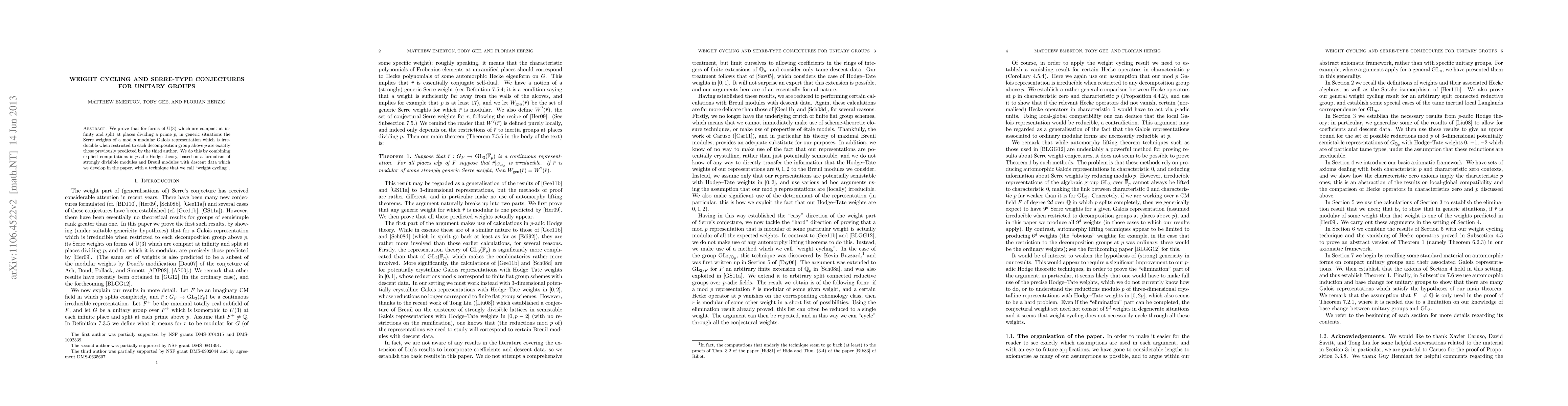 This paper proves that for certain forms of U(3), the Serre weights of a mod p modular Galois representation align with predictions, using techniques from p-adic Hodge theory and a new method called "weight cycling." The approach involves developing formalisms for strongly divisible modules and Breuil modules with descent data.