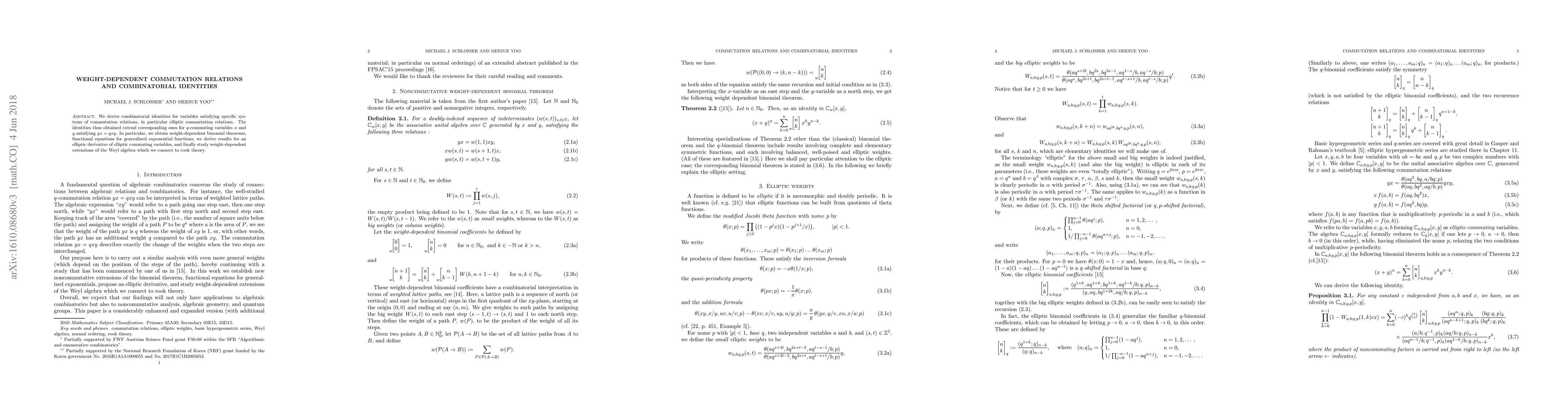 We derive combinatorial identities for variables satisfying specific systems of commutation relations, in particular elliptic commutation relations. The identities thus obtained extend corresponding ones for $q$-commuting variables $x$ and $y$ satisfying $yx=qxy$. In particular, we obtain weight-dependent binomial theorems, functional equations for generalized exponential functions, we derive results for an elliptic derivative of elliptic commuting variables, and finally study weight-dependent extensions of the Weyl algebra which we connect to rook theory.