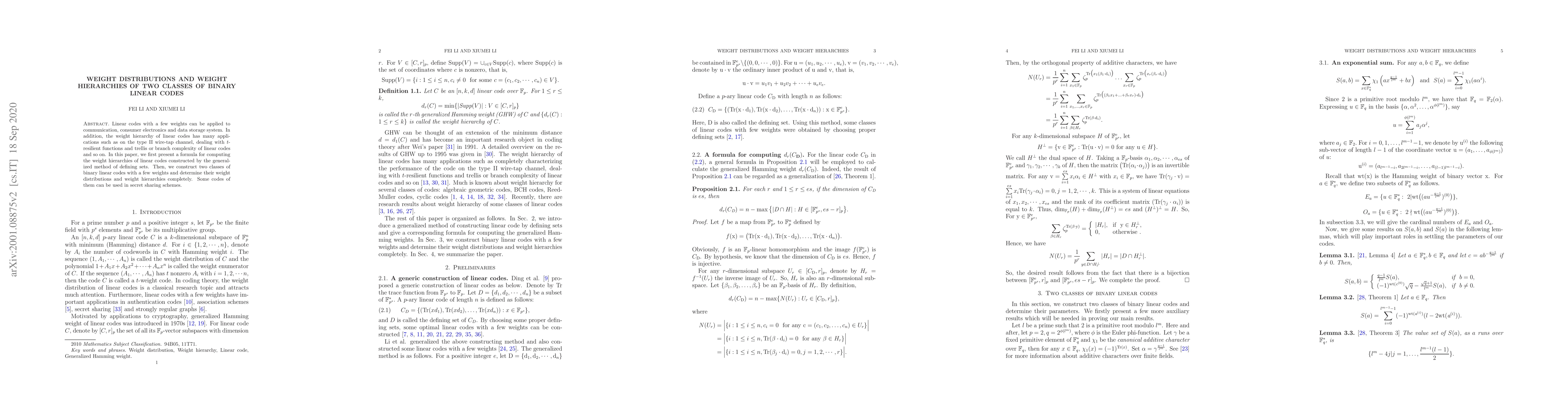 This paper presents a formula for computing weight hierarchies of linear codes using generalized defining sets and constructs two classes of binary linear codes with few weights, fully determining their weight distributions and hierarchies, with applications in communication, consumer electronics, and secret sharing schemes.