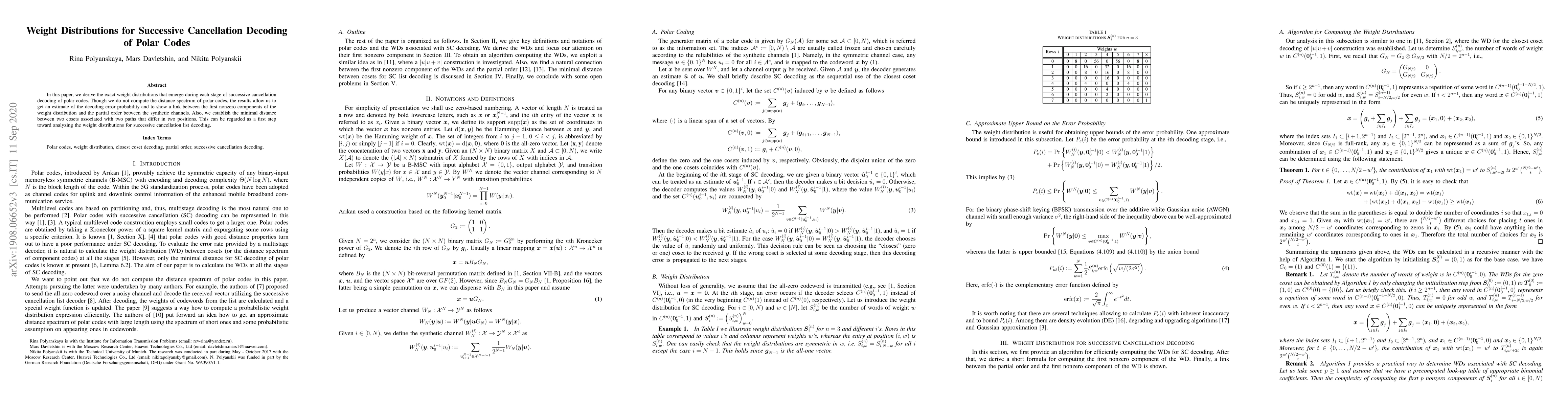 In this paper, we derive the exact weight distributions that emerge during each stage of successive cancellation decoding of polar codes. Though we do not compute the distance spectrum of polar codes, the results allow us to get an estimate of the decoding error probability and to show a link between the first nonzero components of the weight distribution and the partial order between the synthetic channels. Also, we establish the minimal distance between two cosets associated with two paths that differ in two positions. This can be regarded as a first step toward analyzing the weight distributions for the successive cancellation list decoding.