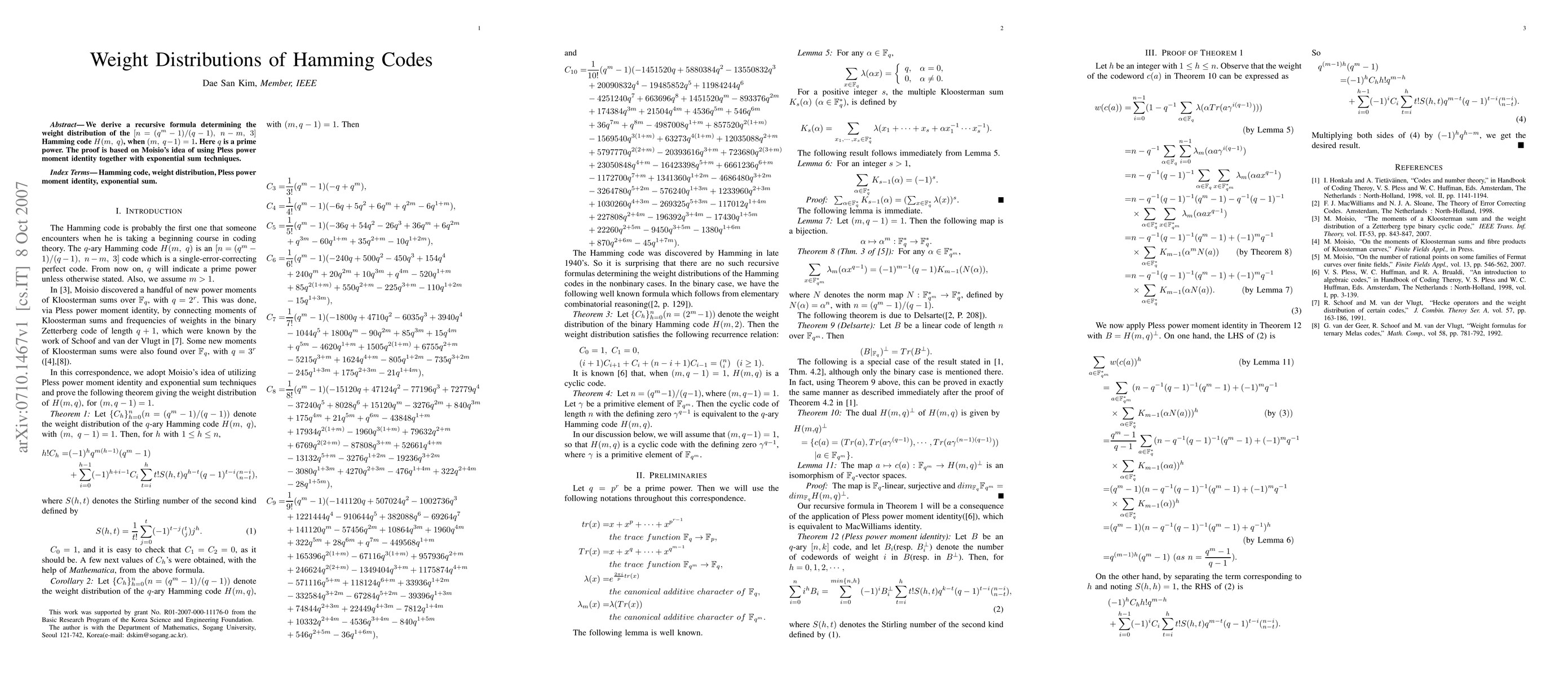 This paper derives a recursive formula for determining the weight distribution of Hamming codes H(m,q) using Moisio's method, which combines Pless power moment identity and exponential sum techniques. The focus is on codes where (m, q-1) equals 1, with q being a prime power.