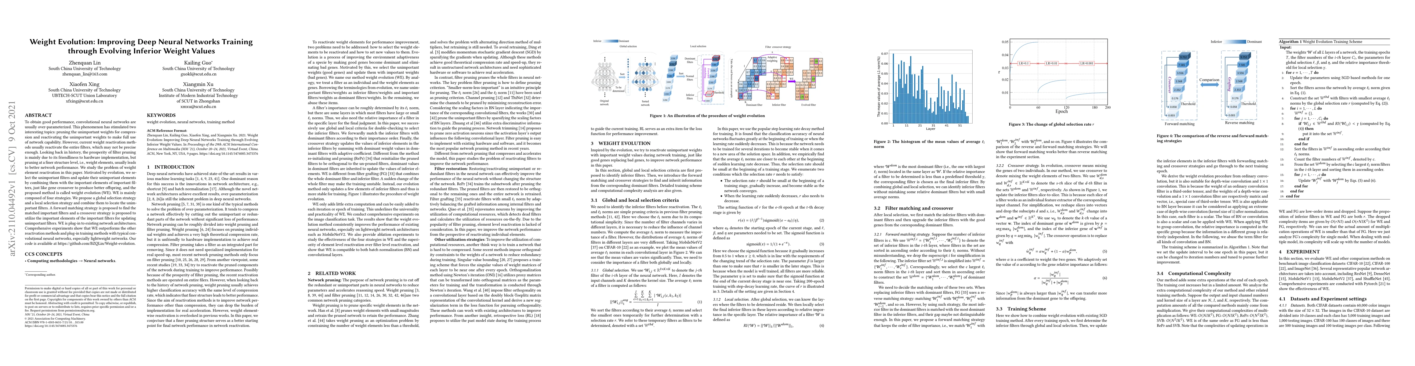 This paper proposes a method called weight evolution (WE) to reactivate unimportant weight elements in over-parameterized convolutional neural networks. WE combines global and local selection strategies to identify and improve underperforming filters through a process inspired by gene crossover, leading to better network performance compared to existing reactivation methods.