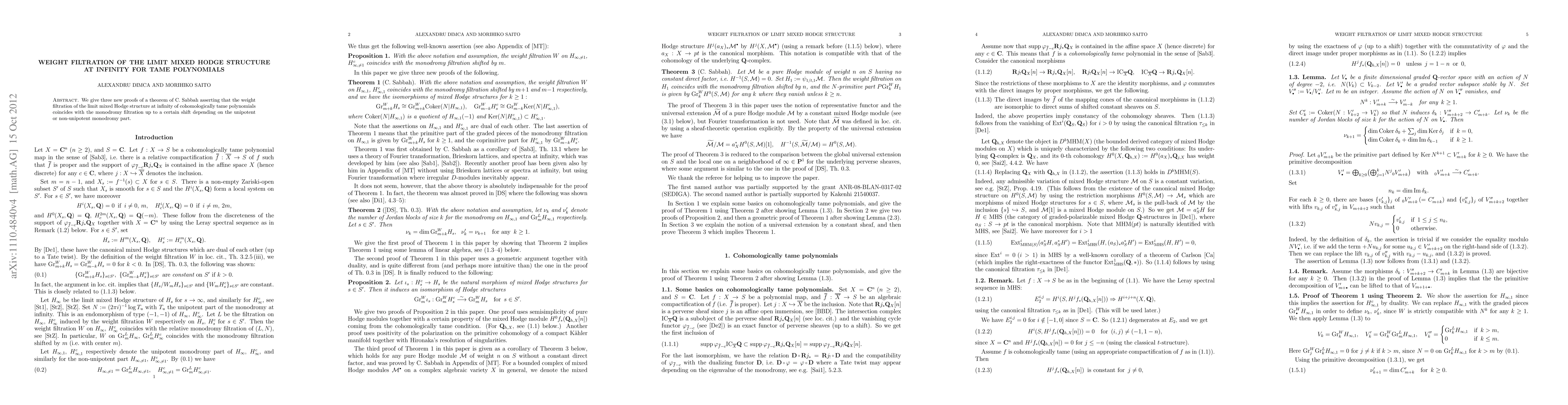 This paper presents three distinct proofs of a theorem by C. Sabbah. The theorem states that for cohomologically tame polynomials, the weight filtration of the limit mixed Hodge structure at infinity matches the monodromy filtration, differing only by a specific shift based on the nature of the monodromy (unipotent or non-unipotent).
