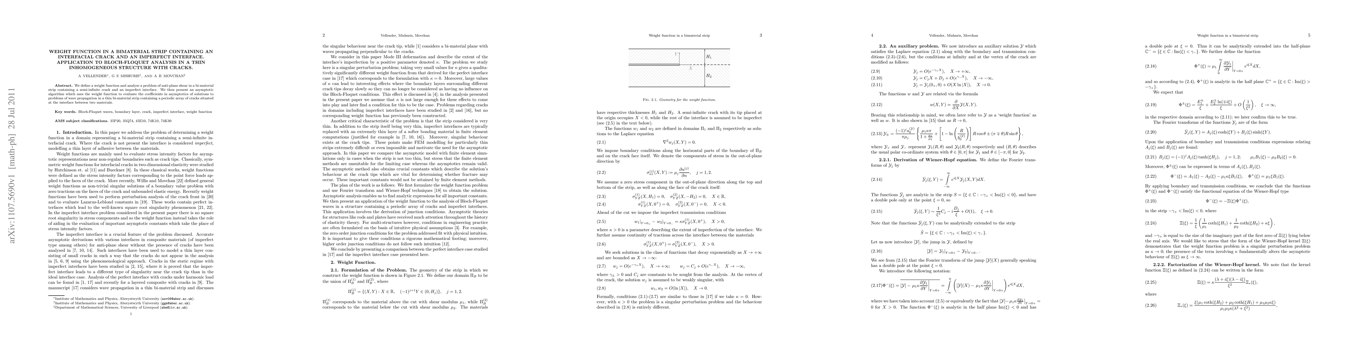 This paper defines a weight function for a bimaterial strip with an interfacial crack and an imperfect interface, focusing on anti-plane shear. It introduces an asymptotic algorithm to evaluate coefficients in wave propagation problems in thin, inhomogeneous structures with periodic cracks.