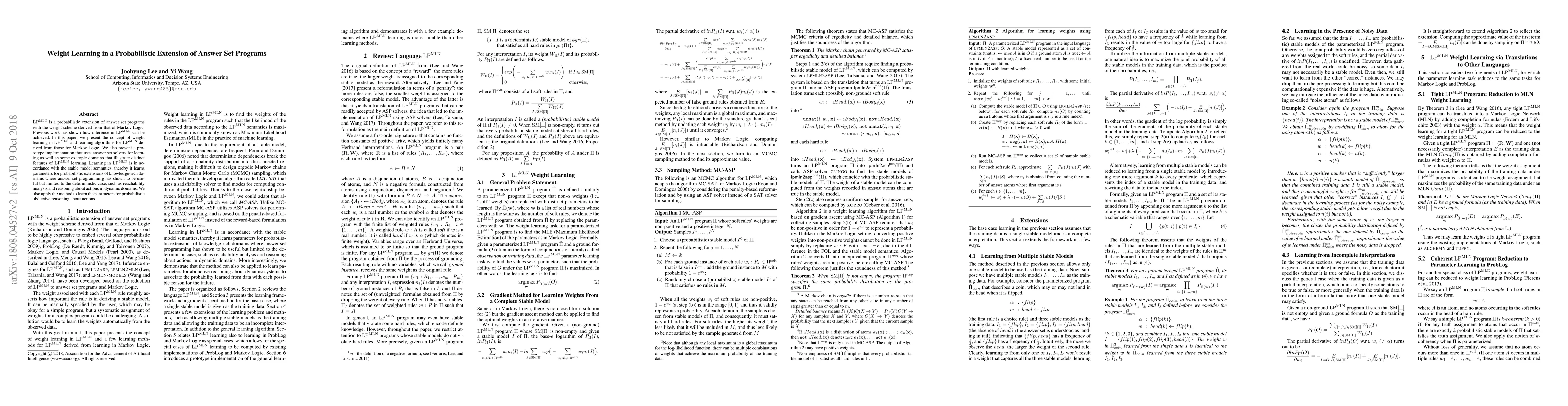 LPMLN is a probabilistic extension of answer set programs with the weight scheme derived from that of Markov Logic. Previous work has shown how inference in LPMLN can be achieved. In this paper, we present the concept of weight learning in LPMLN and learning algorithms for LPMLN derived from those for Markov Logic. We also present a prototype implementation that uses answer set solvers for learning as well as some example domains that illustrate distinct features of LPMLN learning. Learning in LPMLN is in accordance with the stable model semantics, thereby it learns parameters for probabilistic extensions of knowledge-rich domains where answer set programming has shown to be useful but limited to the deterministic case, such as reachability analysis and reasoning about actions in dynamic domains. We also apply the method to learn the parameters for probabilistic abductive reasoning about actions.