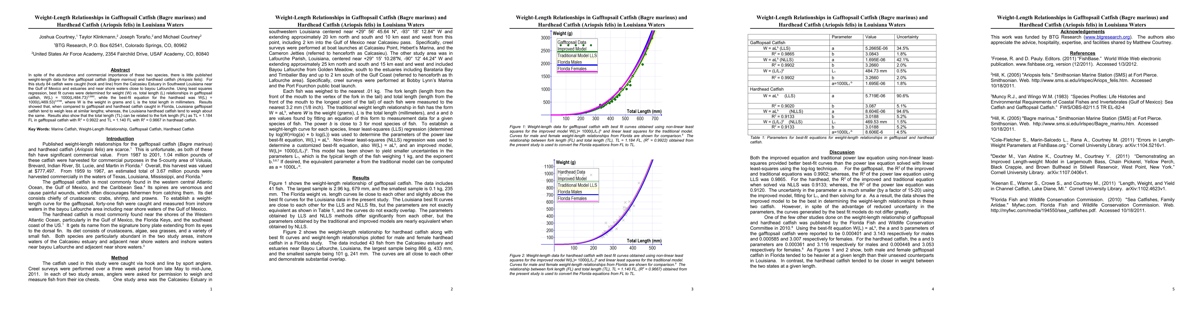 In spite of the abundance and commercial importance of these two species, there is little published weight-length data for the gafftopsail catfish (Bagre marinus) and hardhead catfish (Ariopsis felis). For this study 84 catfish were caught (hook and line) from the Calcasieu Estuary in Southwest Louisiana near the Gulf of Mexico and estuaries and near shore waters close to bayou Lafourche. Using least squares regression, best fit curves were determined for weight (W) vs. total length (L) relationships in gafftopsail catfish, W(L) = 1000(L/484.73)^3.2660, while the best-fit equation for the hardhead was W(L) = 1000(L/469.53)^3.0188, where W is the weight in grams and L is the total length in millimeters. Results showed that, when compared to gafftopsail and hardhead catfish caught in Florida, Louisiana gafftopsail catfish tend to weigh less at similar lengths; whereas, the Louisiana hardhead catfish tend to weigh about the same. Results also show that the total length (TL) can be related to the fork length (FL) as TL = 1.184 FL in gafftopsail catfish with R^2 = 0.9922 and TL = 1.140 FL with R^2 = 0.9667 in hardhead catfish.
