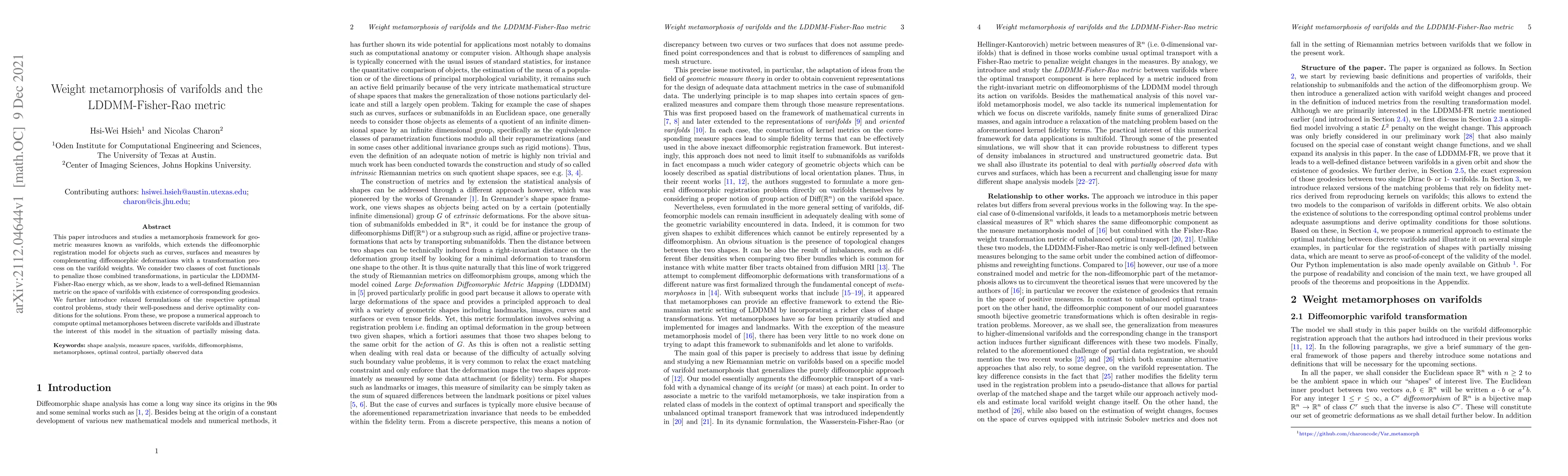 This paper introduces and studies a metamorphosis framework for geometric measures known as varifolds, which extends the diffeomorphic registration model for objects such as curves, surfaces and measures by complementing diffeomorphic deformations with a transformation process on the varifold weights. We consider two classes of cost functionals to penalize those combined transformations, in particular the LDDMM-Fisher-Rao energy which, as we show, leads to a well-defined Riemannian metric on the space of varifolds with existence of corresponding geodesics. We further introduce relaxed formulations of the respective optimal control problems, study their well-posedness and derive optimality conditions for the solutions. From these, we propose a numerical approach to compute optimal metamorphoses between discrete varifolds and illustrate the interest of this model in the situation of partially missing data.