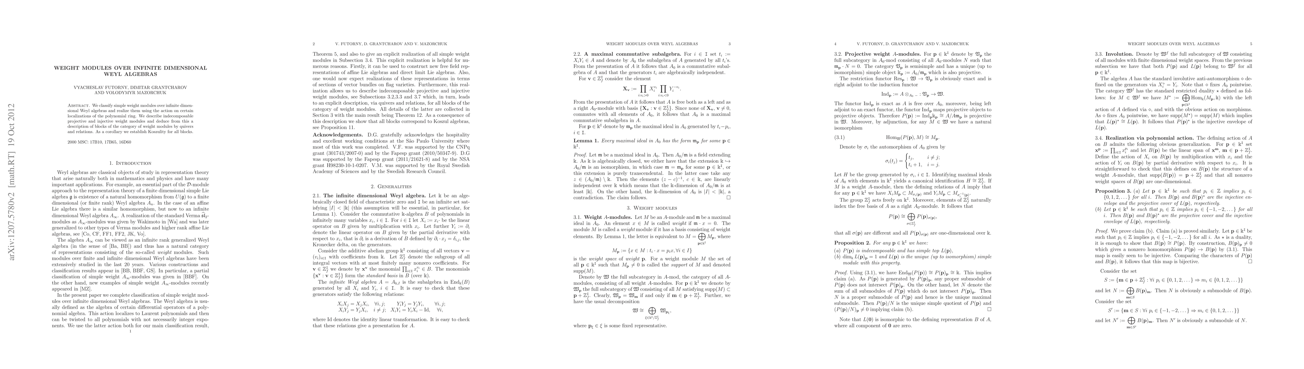 This paper classifies simple weight modules over infinite dimensional Weyl algebras and realizes them via localizations of the polynomial ring. It also explores indecomposable projective and injective weight modules, leading to a description of module category blocks through quivers and relations, and establishes Koszulity for all blocks.