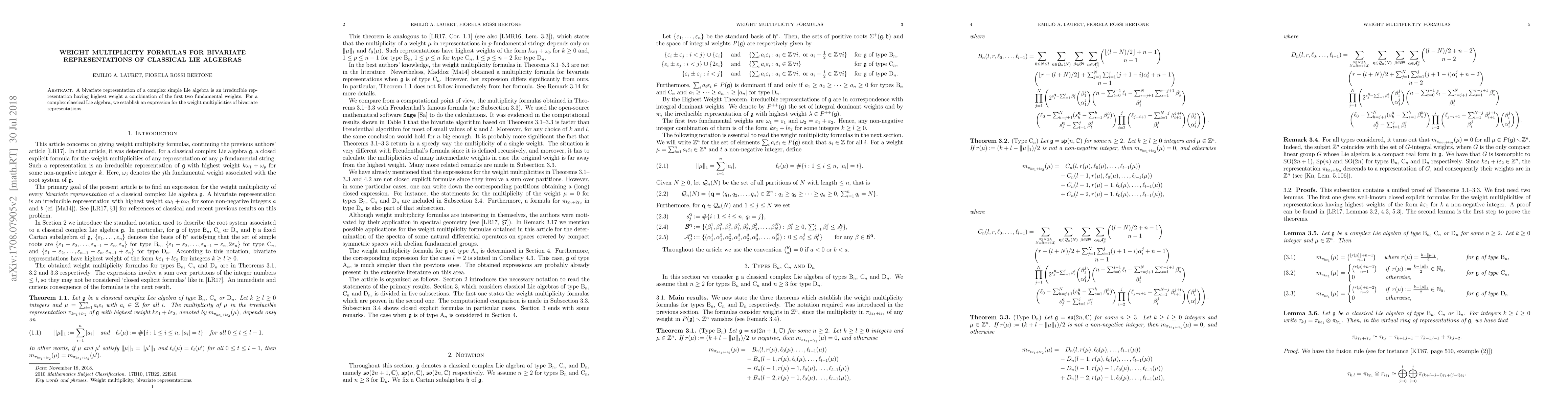 Summary: This paper establishes a formula for the weight multiplicities in bivariate representations of classical complex Lie algebras, where the highest weight is a combination of the first two fundamental weights. The results provide a comprehensive expression for these multiplicities.