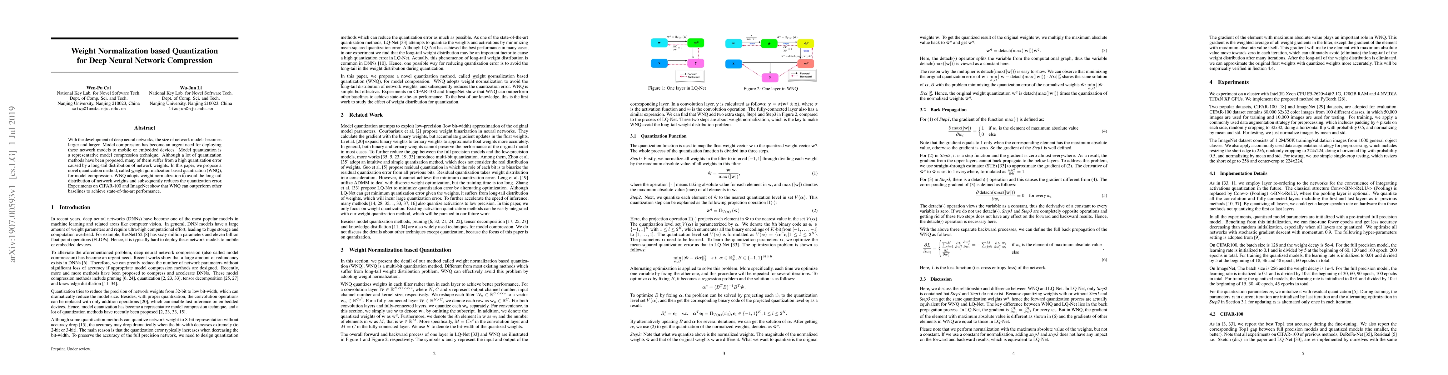 This paper proposes a weight normalization based quantization method (WNQ) for deep neural network compression, which addresses the high quantization error caused by long-tail weight distributions. Experimental results on CIFAR-100 and ImageNet demonstrate that WNQ achieves state-of-the-art performance compared to other quantization methods.