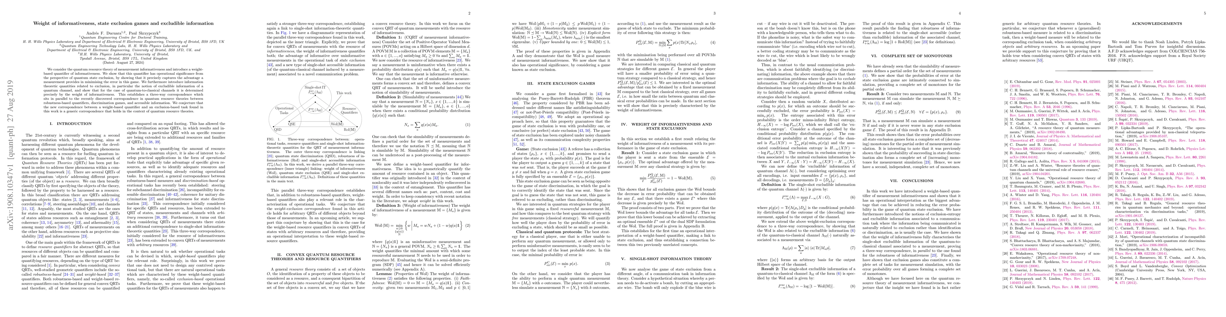 We consider the quantum resource theory of measurement informativeness and introduce a weight-based quantifier of informativeness. We show that this quantifier has operational significance from the perspective of quantum state exclusion, by showing that it precisely captures the advantage a measurement provides in minimising the error in this game. We furthermore introduce information theoretic quantities related to exclusion, in particular the notion of excludible information of a quantum channel, and show that for the case of quantum-to-classical channels it is determined precisely by the weight of informativeness. This establishes a three-way correspondence which sits in parallel to the recently discovered correspondence in quantum resource theories between robustness-based quantifiers, discrimination games, and accessible information. We conjecture that the new correspondence between a weight-based quantifier and an exclusion-based task found in this work is a generic correspondence that holds in the context of quantum resource theories.