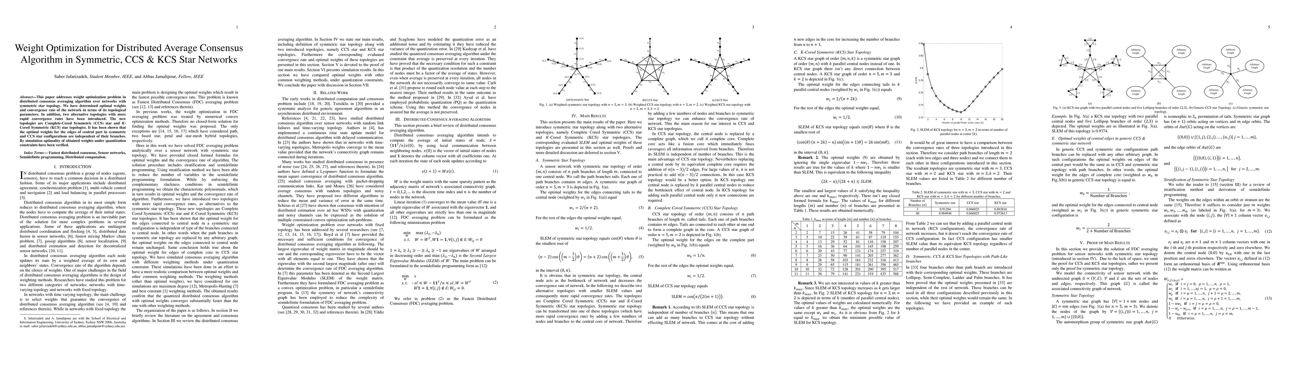 This paper addresses weight optimization problem in distributed consensus averaging algorithm over networks with symmetric star topology. We have determined optimal weights and convergence rate of the network in terms of its topological parameters. In addition, two alternative topologies with more rapid convergence rates have been introduced. The new topologies are Complete-Cored Symmetric (CCS) star and K-Cored Symmetric (KCS) star topologies. It has been shown that the optimal weights for the edges of central part in symmetric and CCS star configurations are independent of their branches. By simulation optimality of obtained weights under quantization constraints have been verified.