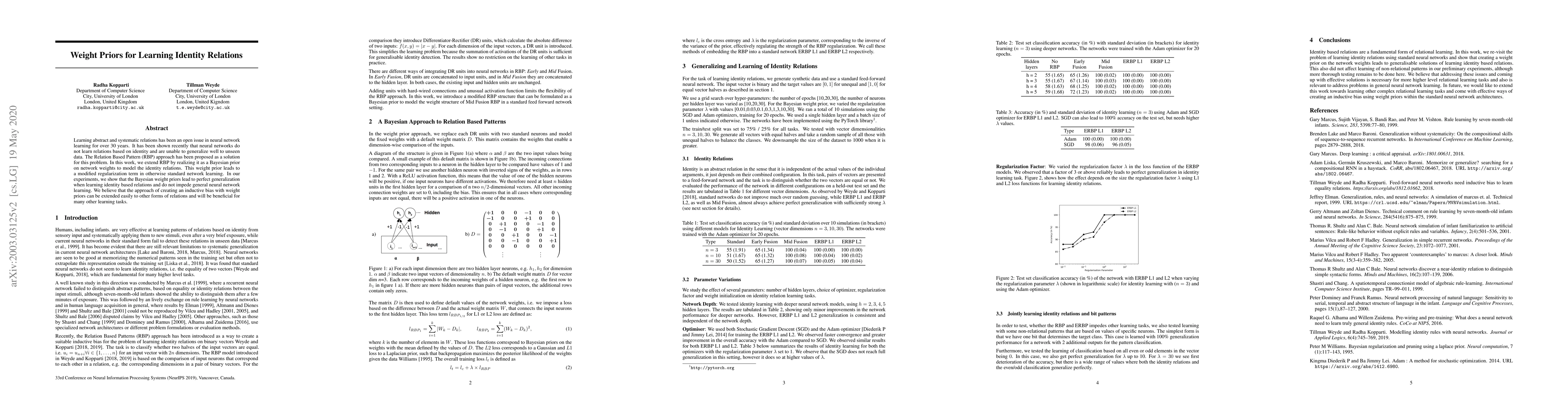 This paper proposes using Bayesian weight priors to model identity relations in neural networks, enhancing the Relation Based Pattern (RBP) approach. The experiments demonstrate perfect generalization for identity-based relations without hindering general neural network learning.