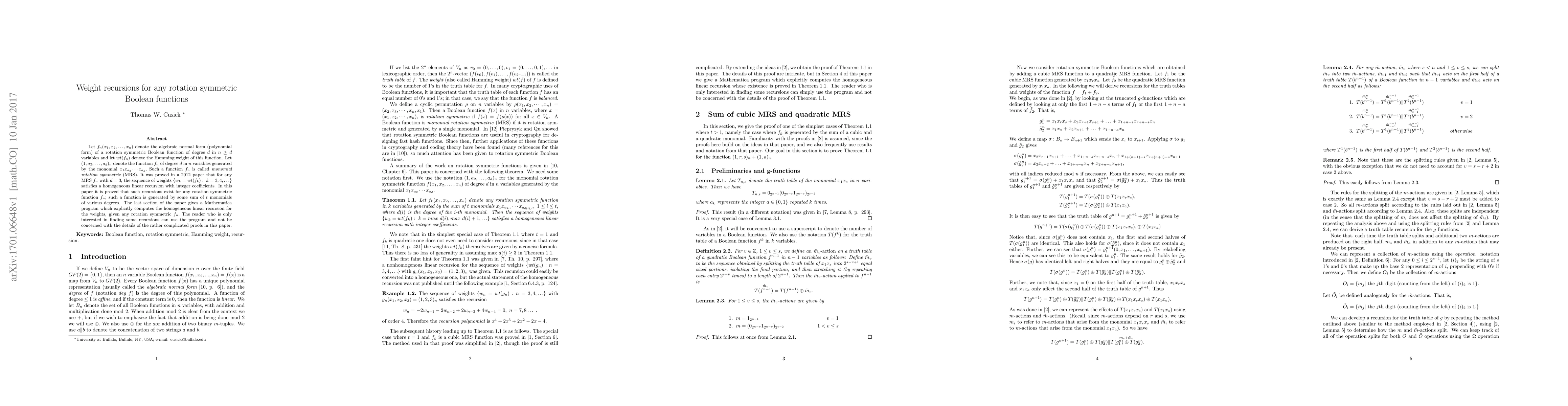 Let $f_n(x_1, x_2, \ldots, x_n)$ denote the algebraic normal form (polynomial form) of a rotation symmetric Boolean function of degree $d$ in $n \geq d$ variables and let $wt(f_n)$ denote the Hamming weight of this function. Let $(1, a_2, \ldots, a_d)_n$ denote the function $f_n$ of degree $d$ in $n$ variables generated by the monomial $x_1x_{a_2} \cdots x_{a_d}.$ Such a function $f_n$ is called {\em monomial rotation symmetric} (MRS). It was proved in a $2012$ paper that for any MRS $f_n$ with $d=3,$ the sequence of weights $\{w_k = wt(f_k):~k = 3, 4, \ldots\}$ satisfies a homogeneous linear recursion with integer coefficients. In this paper it is proved that such recursions exist for any rotation symmetric function $f_n;$ such a function is generated by some sum of $t$ monomials of various degrees. The last section of the paper gives a Mathematica program which explicitly computes the homogeneous linear recursion for the weights, given any rotation symmetric $f_n.$ The reader who is only interested in finding some recursions can use the program and not be concerned with the details of the rather complicated proofs in this paper.