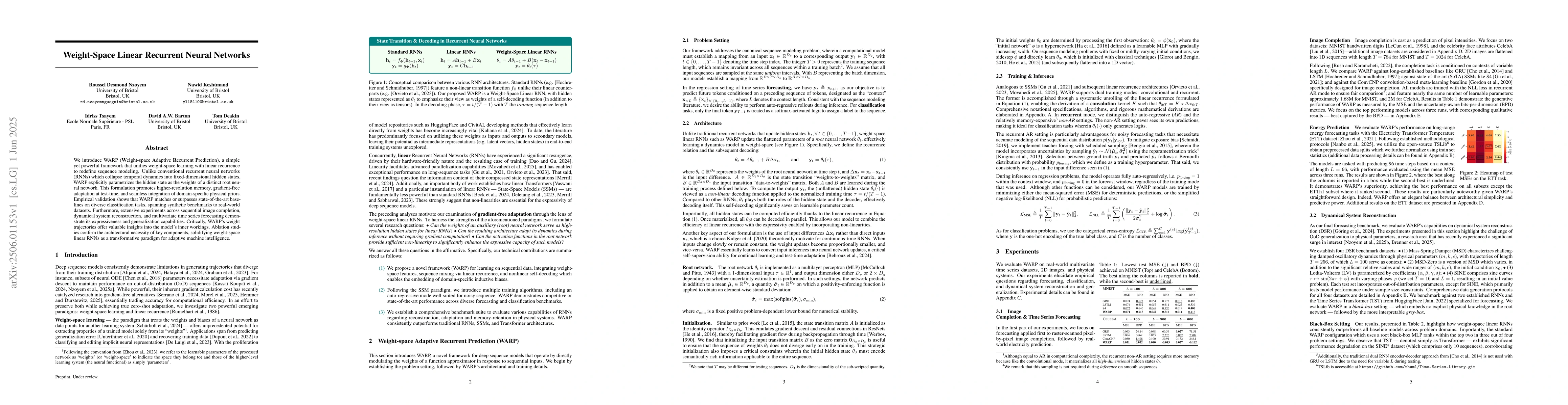 Weight-Space Linear Recurrent Neural Networks (WARP) unifies weight-space learning with linear recurrence to redefine sequence modeling, offering higher-resolution memory and gradient-free adaptation at test-time, with impressive results on diverse classification tasks.