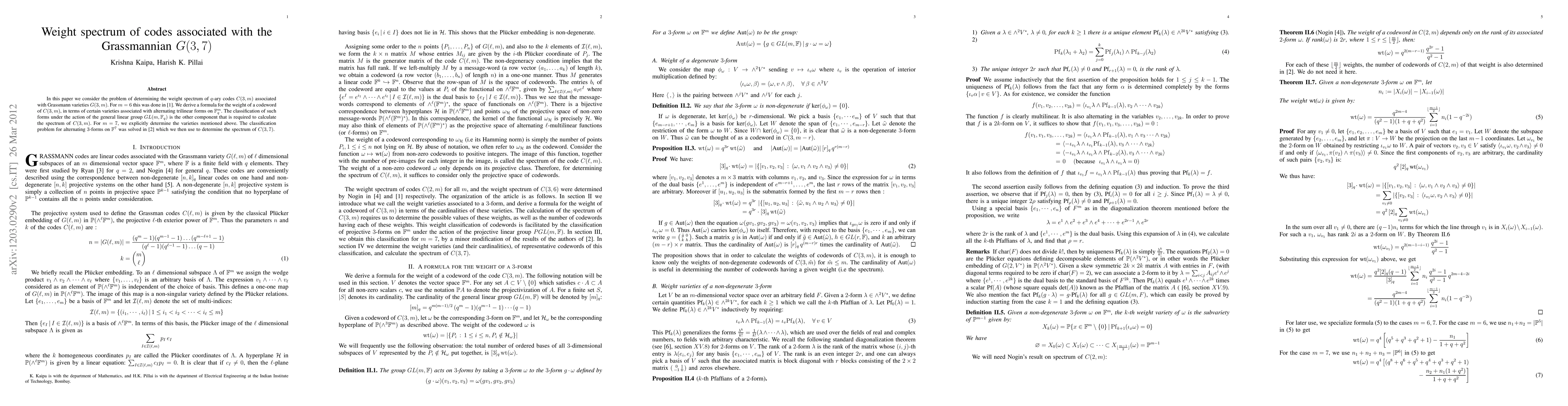 This paper determines the weight spectrum of q-ary codes C(3,m) related to Grassmannian G(3,7). It derives a formula for codeword weights using varieties associated with alternating trilinear forms, leveraging classifications solved by Cohen and Helminck to find the spectrum for m=7.