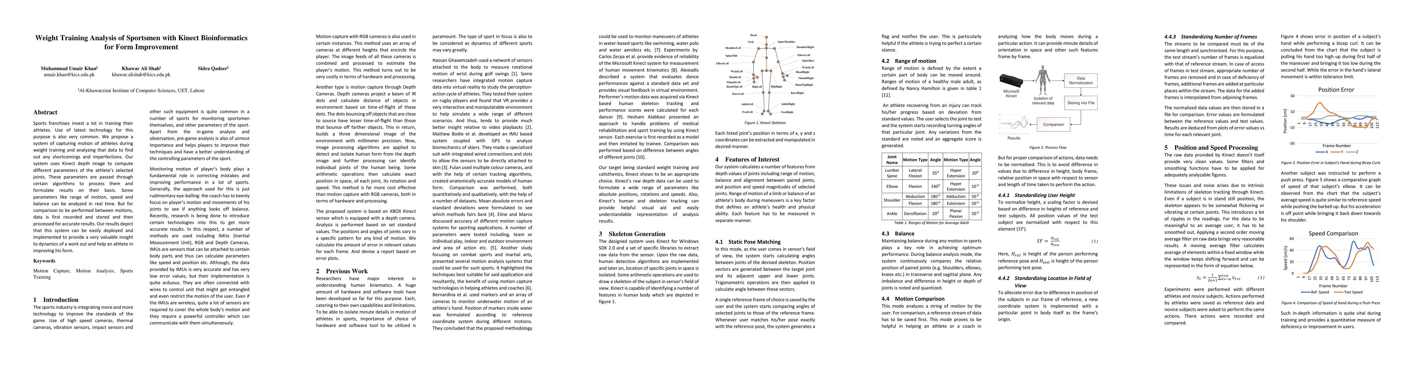 Sports franchises invest a lot in training their athletes. use of latest technology for this purpose is also very common. We propose a system of capturing motion of athletes during weight training and analyzing that data to find out any shortcomings and imperfections. Our system uses Kinect depth image to compute different parameters of athlete's selected joints. These parameters are passed through certain algorithms to process them and formulate results on their basis. Some parameters like range of motion, speed and balance can be analyzed in real time. But for comparison to be performed between motions, data is first recorded and stored and then processed for accurate results. Our results depict that this system can be easily deployed and implemented to provide a very valuable insight to dynamics of a work out and help an athlete in improving his form.