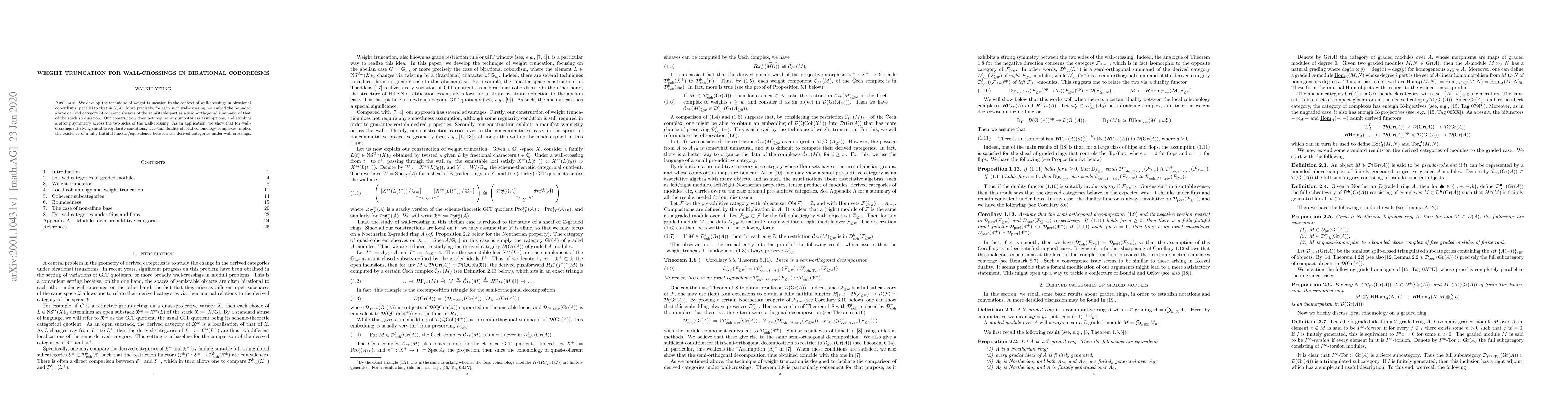 This paper introduces weight truncation to study wall-crossings in birational cobordisms, embedding derived categories of coherent sheaves as semi-orthogonal summands without requiring smoothness. The technique reveals strong symmetry and, under suitable conditions, establishes a duality implying a fully faithful functor between derived categories across wall-crossings.
