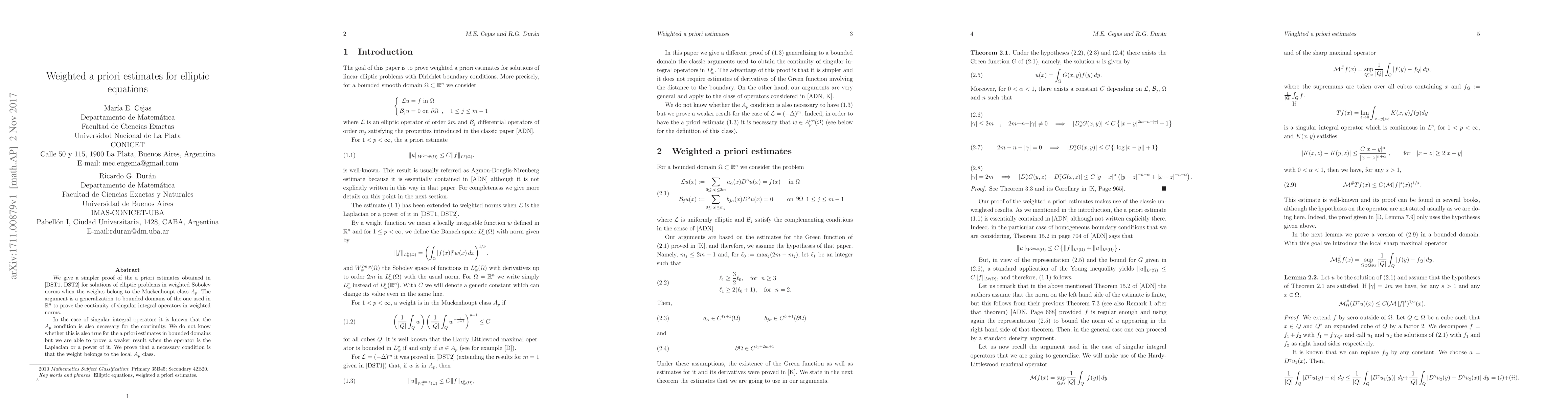 This paper provides a simplified proof of a priori estimates for elliptic equations in weighted Sobolev norms, generalizing the method used for singular integral operators in $\mathbb{R}^n$. The authors establish that weights belonging to the local $A_p$ class are necessary for these estimates, particularly for the Laplacian or its powers.
