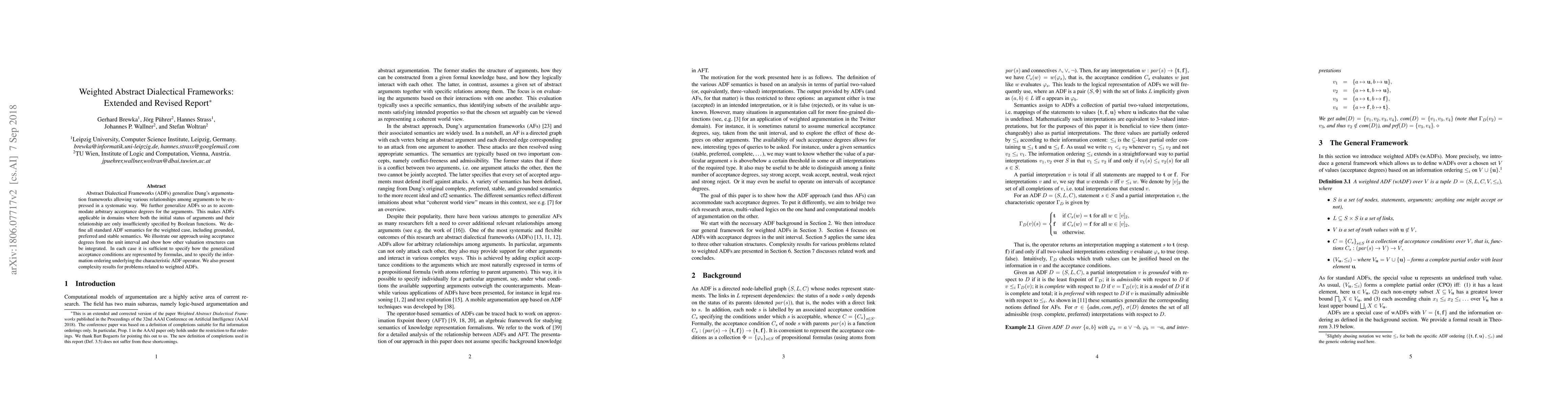 Abstract Dialectical Frameworks (ADFs) generalize Dung's argumentation frameworks allowing various relationships among arguments to be expressed in a systematic way. We further generalize ADFs so as to accommodate arbitrary acceptance degrees for the arguments. This makes ADFs applicable in domains where both the initial status of arguments and their relationship are only insufficiently specified by Boolean functions. We define all standard ADF semantics for the weighted case, including grounded, preferred and stable semantics. We illustrate our approach using acceptance degrees from the unit interval and show how other valuation structures can be integrated. In each case it is sufficient to specify how the generalized acceptance conditions are represented by formulas, and to specify the information ordering underlying the characteristic ADF operator. We also present complexity results for problems related to weighted ADFs.