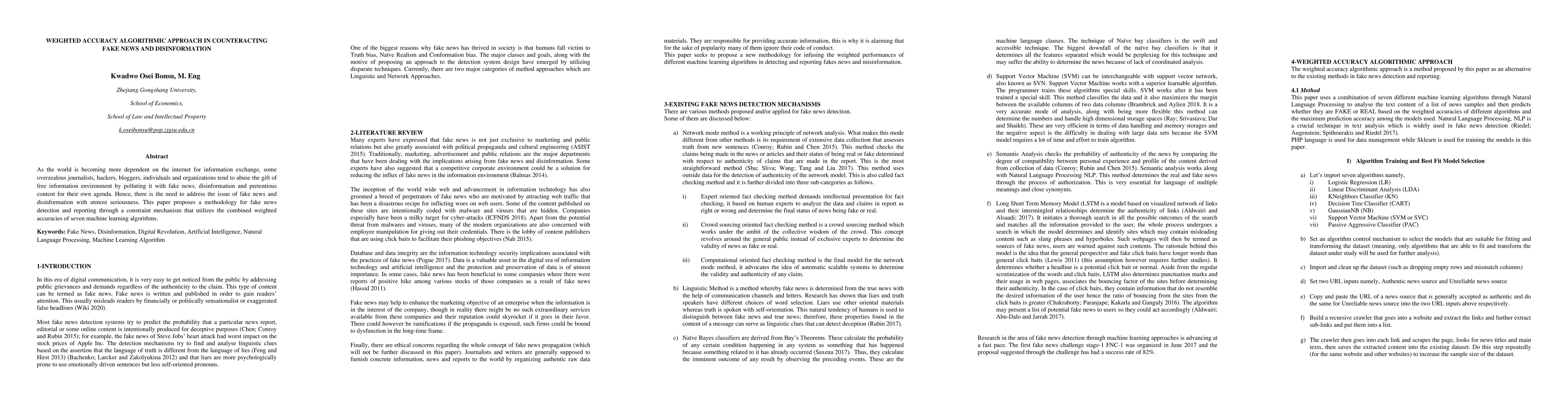 This paper proposes a methodology to counteract fake news using a weighted accuracy algorithm that combines the accuracies of four machine learning algorithms to detect and report false information effectively. The approach aims to address the growing issue of disinformation in the online information environment.