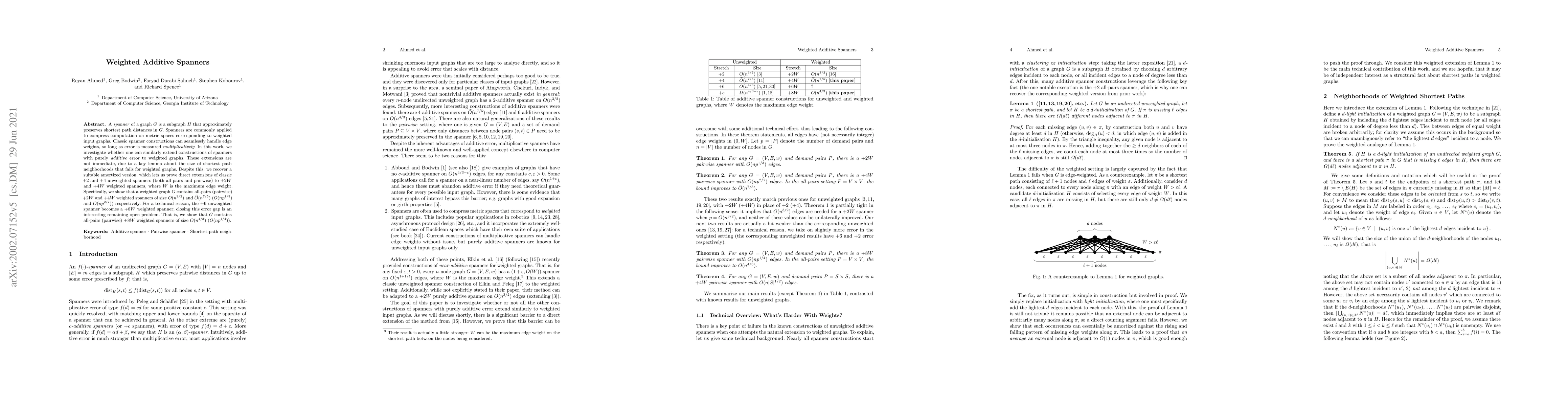 This paper explores the construction of weighted additive spanners for graphs, extending classic spanners with additive error to weighted graphs. The authors prove that weighted graphs can have all-pairs and pairwise spanners with additive errors of $+2W$ and $+4W$, respectively, with specific sizes, while noting the $+6$ unweighted spanner becomes a $+8W$ weighted spanner, leaving the reduction of this error as an open problem.