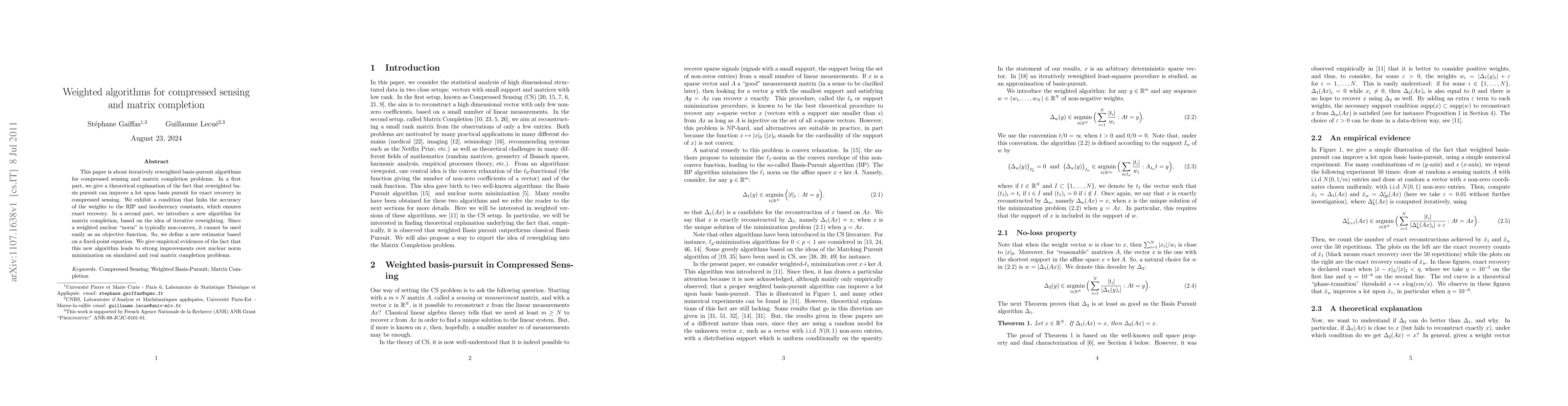 This paper develops iterative reweighted basis-pursuit algorithms for compressed sensing and matrix completion, showing improved recovery accuracy through weight optimization linked to RIP and incoherency constants. It also proposes a novel matrix completion algorithm based on a fixed-point equation for a weighted nuclear "norm," demonstrating significant performance gains over nuclear norm minimization.
