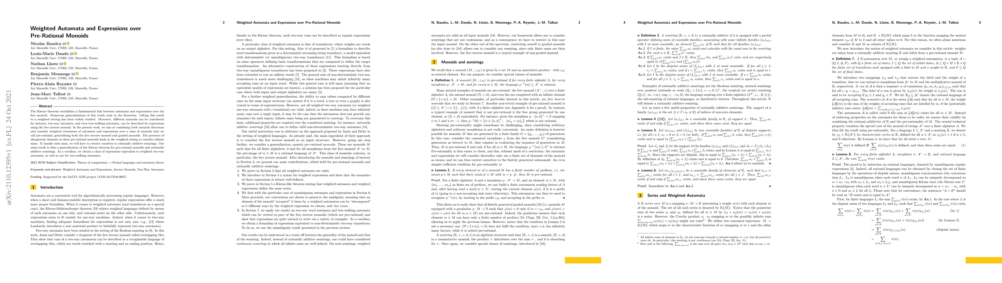The Kleene theorem establishes a fundamental link between automata and expressions over the free monoid. Numerous generalisations of this result exist in the literature. Lifting this result to a weighted setting has been widely studied. Moreover, different monoids can be considered: for instance, two-way automata, and even tree-walking automata, can be described by expressions using the free inverse monoid. In the present work, we aim at combining both research directions and consider weighted extensions of automata and expressions over a class of monoids that we call pre-rational, generalising both the free inverse monoid and graded monoids. The presence of idempotent elements in these pre-rational monoids leads in the weighted setting to consider infinite sums. To handle such sums, we will have to restrict ourselves to rationally additive semirings. Our main result is thus a generalisation of the Kleene theorem for pre-rational monoids and rationally additive semirings. As a corollary, we obtain a class of expressions equivalent to weighted two-way automata, as well as one for tree-walking automata.