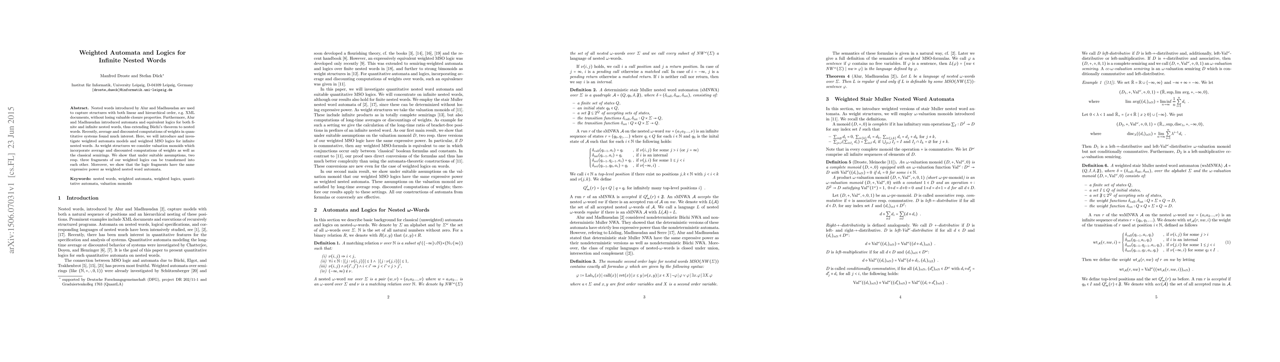 This paper introduces weighted automata and logics for infinite nested words, extending B\"uchi's theorem. It explores valuation monoids for average and discounted weight computations and demonstrates transformations and equivalences among different logic fragments and automata.
