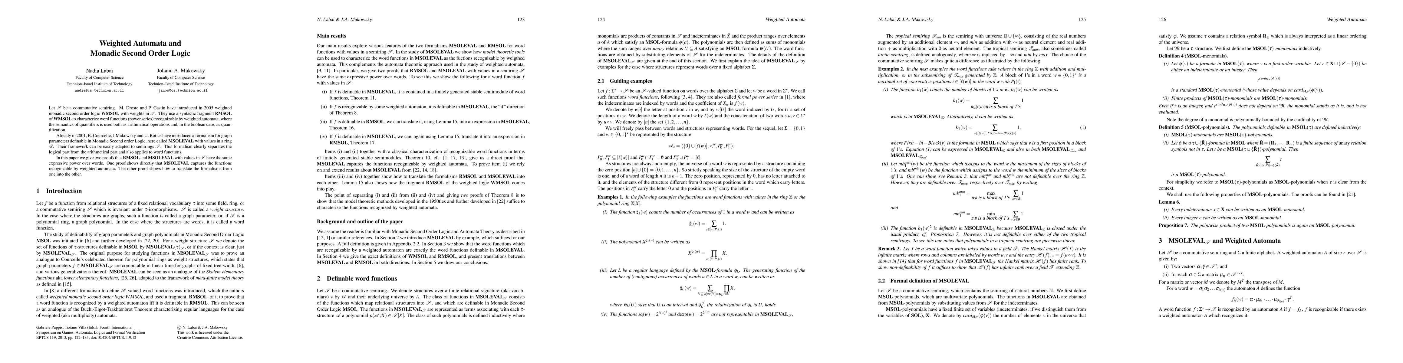 The paper provides two proofs that RMSOL and MSOLEVAL with values in a commutative semiring S have the same expressive power over words. One proof shows directly that MSOLEVAL captures the functions recognizable by weighted automata, while the other proof demonstrates how to translate the formalisms from one into the other.