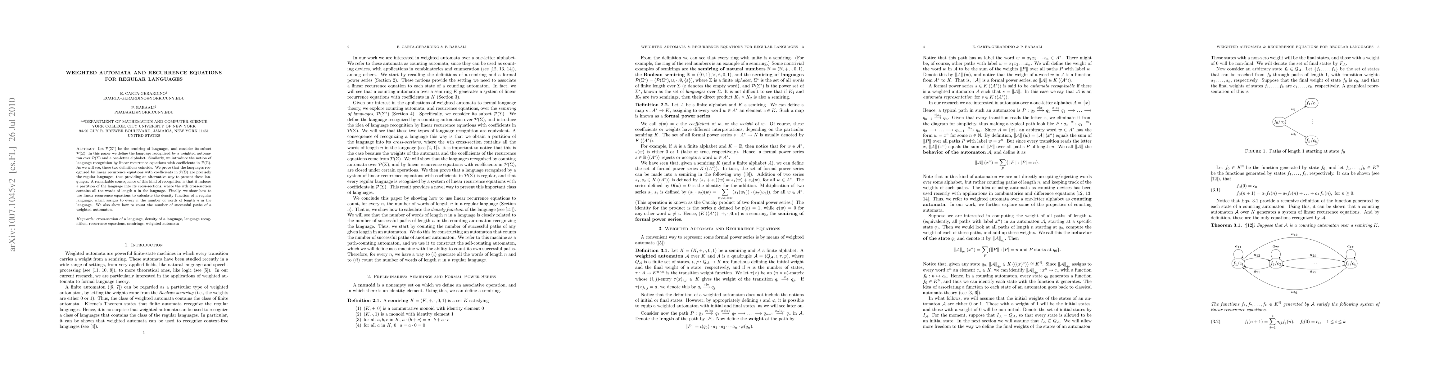 This paper defines weighted automata over a subset of language semirings and introduces linear recurrence equations for recognizing regular languages. It demonstrates that these two methods are equivalent and provides a partition of regular languages into cross-sections based on word length, along with methods to compute language density and successful path counts.