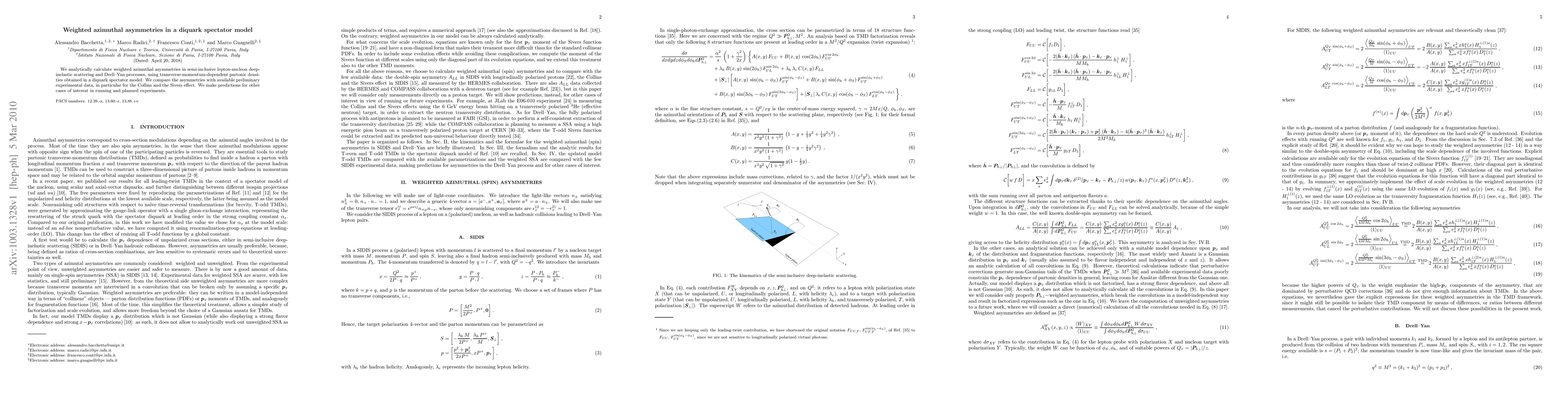 We analytically calculate weighted azimuthal asymmetries in semi-inclusive lepton-nucleon deep-inelastic scattering and Drell-Yan processes, using transverse-momentum-dependent partonic densities obtained in a diquark spectator model. We compare the asymmetries with available preliminary experimental data, in particular for the Collins and the Sivers effect. We make predictions for other cases of interest in running and planned experiments.