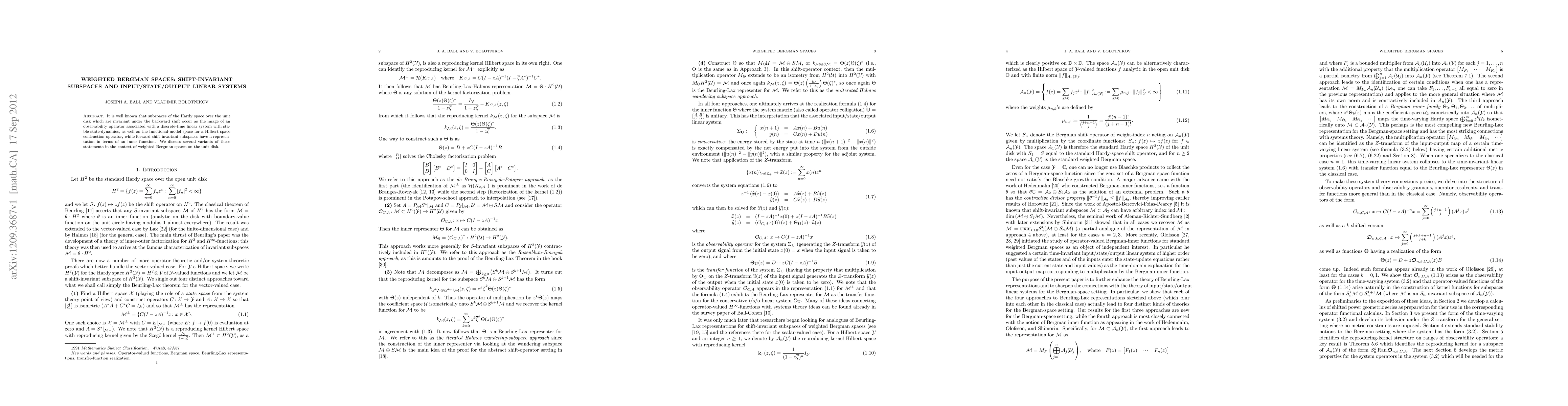 Summary: This paper explores shift-invariant subspaces within weighted Bergman spaces on the unit disk, linking them to observability operators in discrete-time linear systems and Hilbert space contraction operators, while also discussing representations involving inner functions.