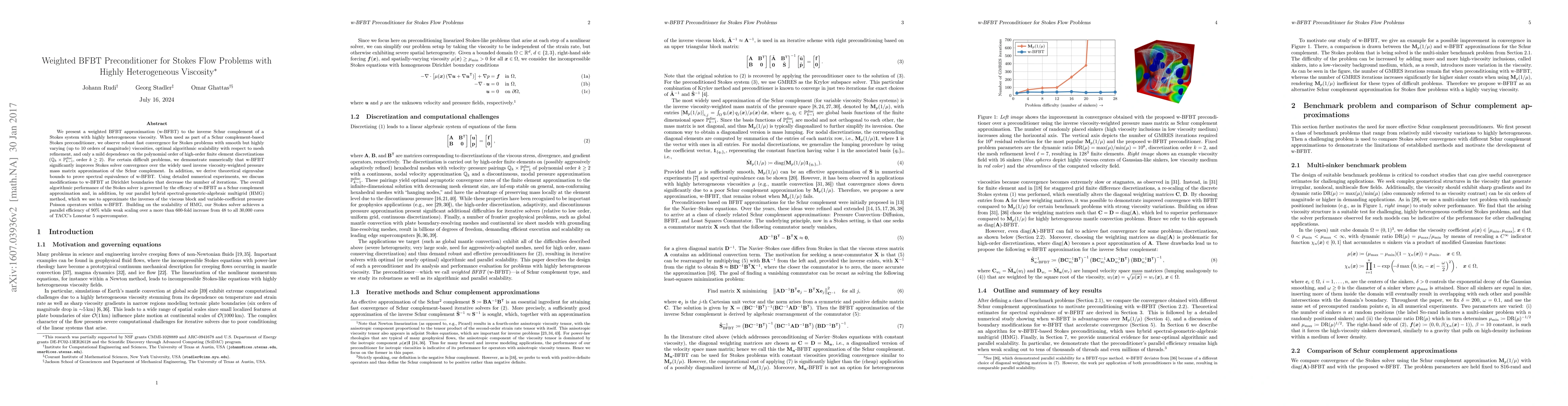 We present a weighted BFBT approximation (w-BFBT) to the inverse Schur complement of a Stokes system with highly heterogeneous viscosity. When used as part of a Schur complement-based Stokes preconditioner, we observe robust fast convergence for Stokes problems with smooth but highly varying (up to 10 orders of magnitude) viscosities, optimal algorithmic scalability with respect to mesh refinement, and only a mild dependence on the polynomial order of high-order finite element discretizations ($Q_k \times P_{k-1}^{disc}$, order $k \ge 2$). For certain difficult problems, we demonstrate numerically that w-BFBT significantly improves Stokes solver convergence over the widely used inverse viscosity-weighted pressure mass matrix approximation of the Schur complement. In addition, we derive theoretical eigenvalue bounds to prove spectral equivalence of w-BFBT. Using detailed numerical experiments, we discuss modifications to w-BFBT at Dirichlet boundaries that decrease the number of iterations. The overall algorithmic performance of the Stokes solver is governed by the efficacy of w-BFBT as a Schur complement approximation and, in addition, by our parallel hybrid spectral-geometric-algebraic multigrid (HMG) method, which we use to approximate the inverses of the viscous block and variable-coefficient pressure Poisson operators within w-BFBT. Building on the scalability of HMG, our Stokes solver achieves a parallel efficiency of 90% while weak scaling over a more than 600-fold increase from 48 to all 30,000 cores of TACC's Lonestar 5 supercomputer.