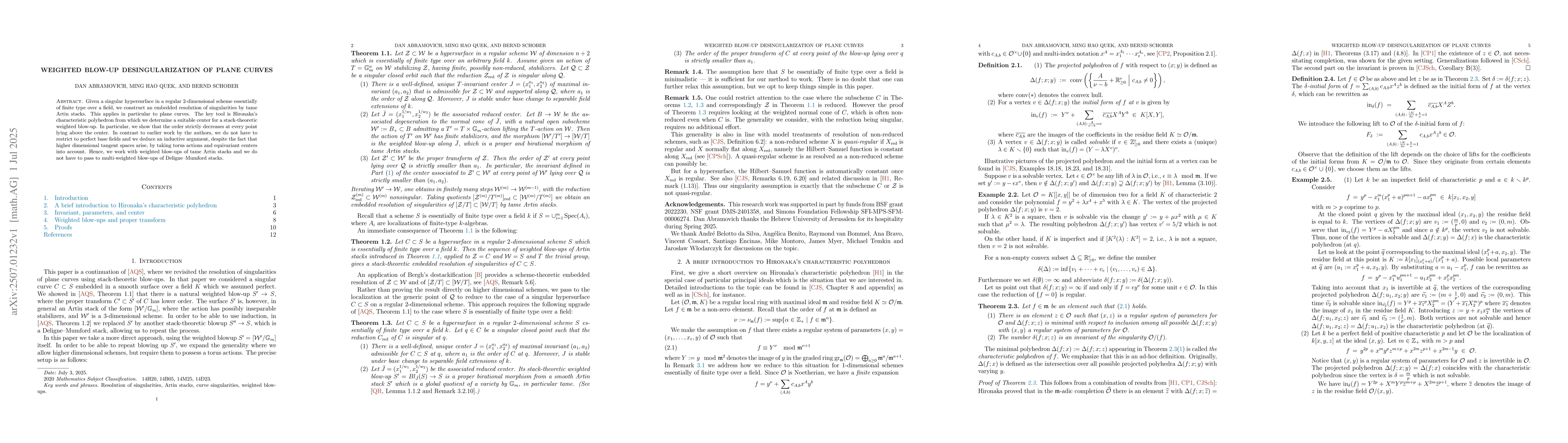 Given a singular hypersurface in a regular 2-dimensional scheme essentially of finite type over a field, we construct an embedded resolution of singularities by tame Artin stacks. This applies in particular to plane curves. The key tool is Hironaka's characteristic polyhedron from which we determine a suitable center for a stack-theoretic weighted blow-up. In particular, we show that the order strictly decreases at every point lying above the center. In contrast to earlier work by the authors, we do not have to restrict to perfect base fields and we deduce an inductive argument, despite the fact that higher dimensional tangent spaces arise, by taking torus actions and equivariant centers into account. Hence, we work with weighted blow-ups of tame Artin stacks and we do not have to pass to multi-weighted blow-ups of Deligne--Mumford stacks.