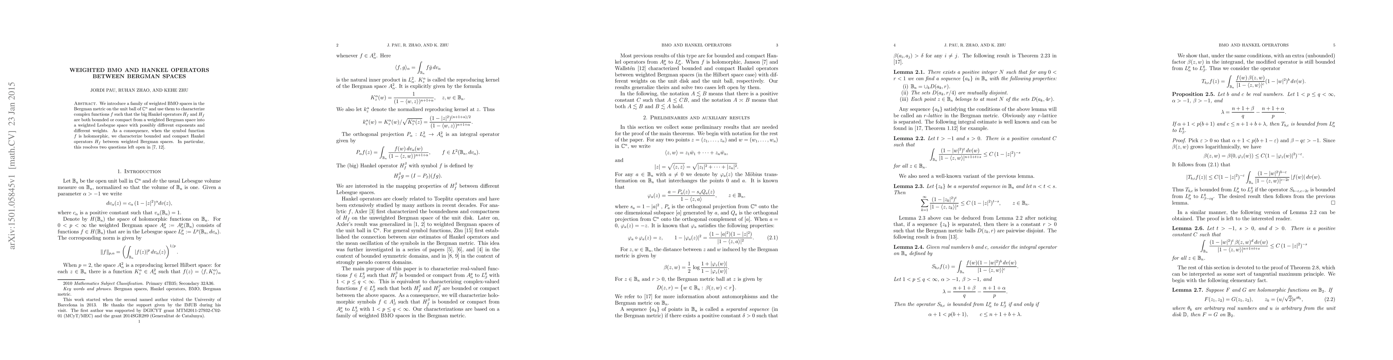 The paper introduces weighted BMO and VMO spaces for the unit ball and uses them to characterize bounded and compact Hankel operators between Bergman spaces, resolving two open problems posed by S. Janson and R. Wallsten from 1988 and 1990 respectively.
