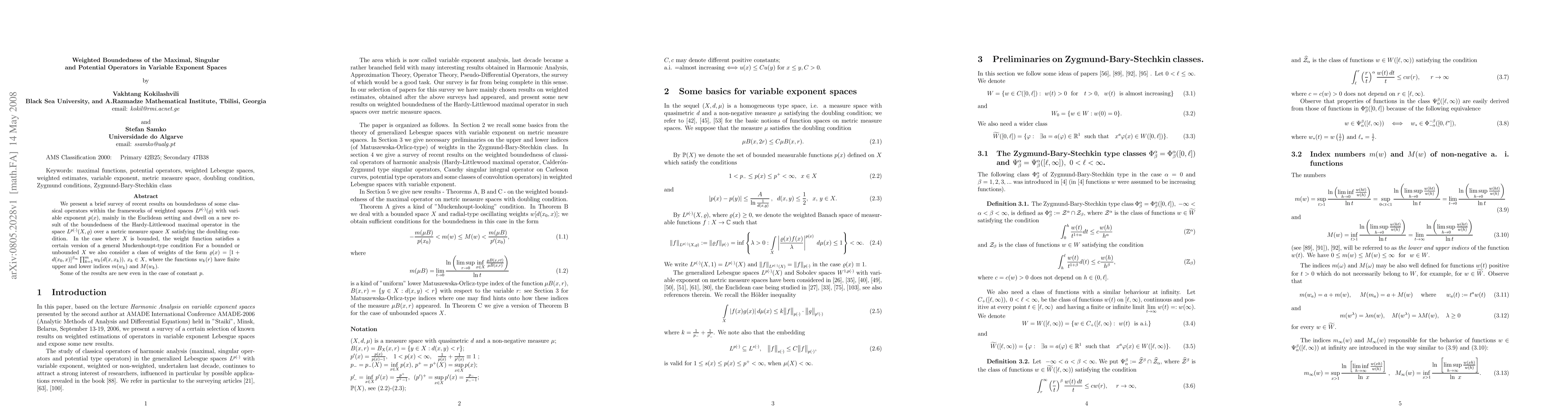 We present a brief survey of recent results on boundedness of some classical operators within the frameworks of weighted spaces $L^{p(\cdot)}(\varrho)$ with variable exponent $p(x)$, mainly in the Euclidean setting and dwell on a new result of the boundedness of the Hardy-Littlewood maximal operator in the space $L^{p(\cdot)}(X,\varrho)$ over a metric measure space $X$ satisfying the doubling condition. In the case where $X$ is bounded, the weight function satisfies a certain version of a general Muckenhoupt-type condition For a bounded or unbounded $X$ we also consider a class of weights of the form $\varrho(x)=[1+d(x_0,x)]^{\bt_\infty}\prod_{k=1}^m w_k(d(x,x_k))$, $x_k\in X$, where the functions $w_k(r)$ have finite upper and lower indices $m(w_k)$ and $M(w_k)$. Some of the results are new even in the case of constant $p$.