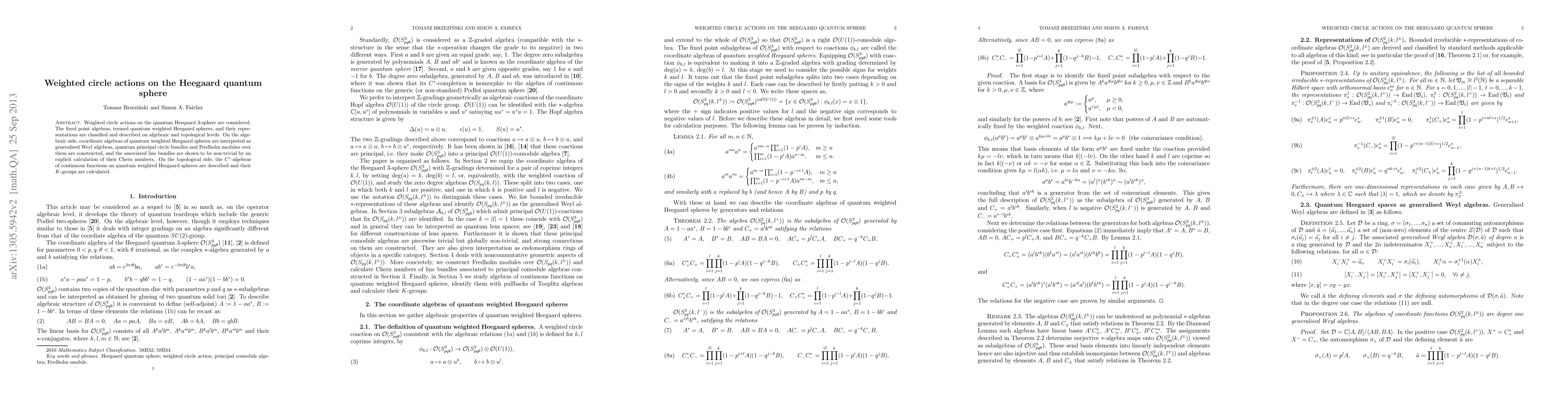 Weighted circle actions on the quantum Heeqaard 3-sphere are considered. The fixed point algebras, termed quantum weighted Heegaard spheres, and their representations are classified and described on algebraic and topological levels. On the algebraic side, coordinate algebras of quantum weighted Heegaard spheres are interpreted as generalised Weyl algebras, quantum principal circle bundles and Fredholm modules over them are constructed, and the associated line bundles are shown to be non-trivial by an explicit calculation of their Chern numbers. On the topological side, the C*-algebras of continuous functions on quantum weighted Heegaard spheres are described and their K-groups are calculated.