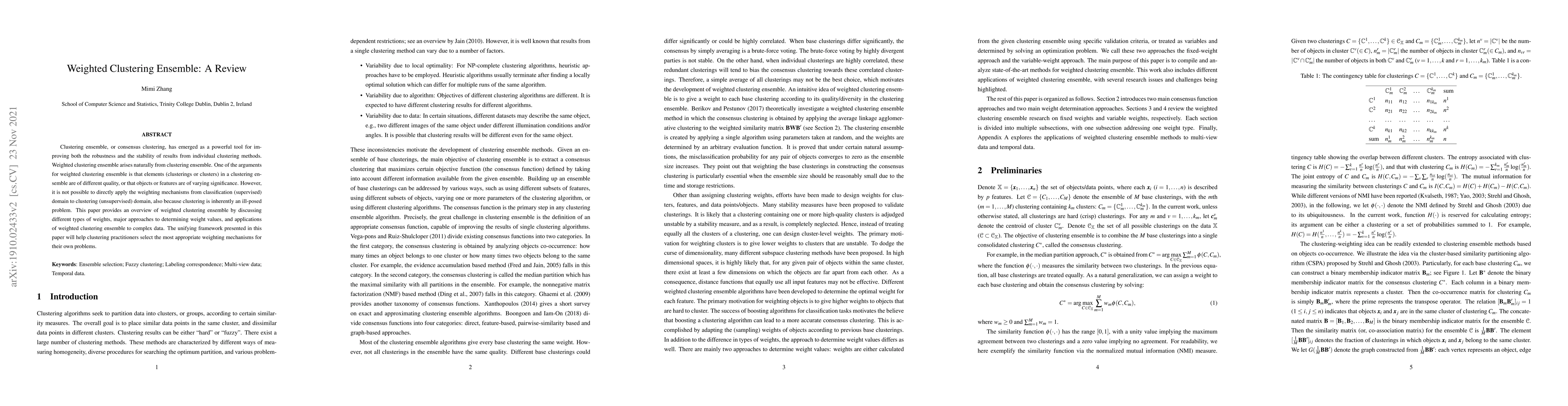 This paper reviews weighted clustering ensemble, emphasizing its role in enhancing the robustness of clustering results. It discusses various weight types, methods for determining weight values, and applications to complex data, providing a framework for practitioners to choose suitable weighting mechanisms.