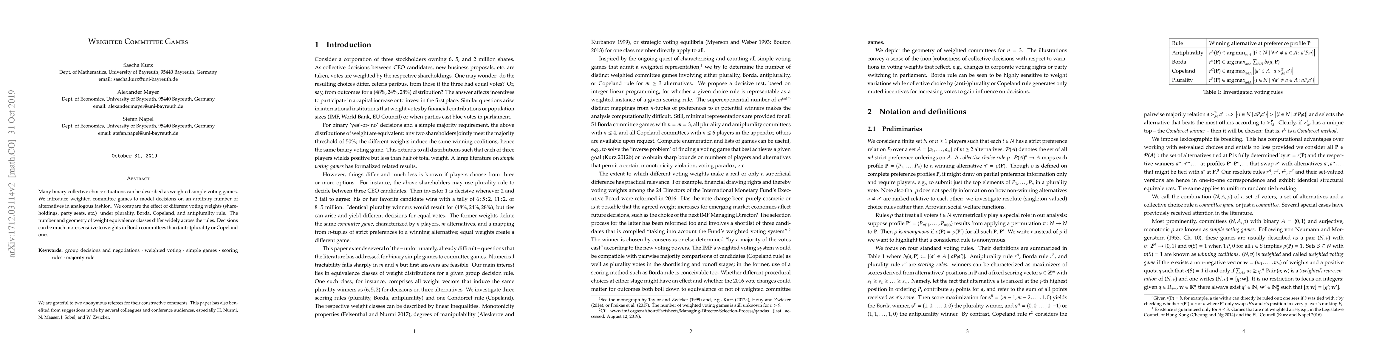 Many binary collective choice situations can be described as weighted simple voting games. We introduce weighted committee games to model decisions on an arbitrary number of alternatives in analogous fashion. We compare the effect of different voting weights (share-holdings, party seats, etc.) under plurality, Borda, Copeland, and antiplurality rule. The number and geometry of weight equivalence classes differ widely across the rules. Decisions can be much more sensitive to weights in Borda committees than (anti-)plurality or Copeland ones.