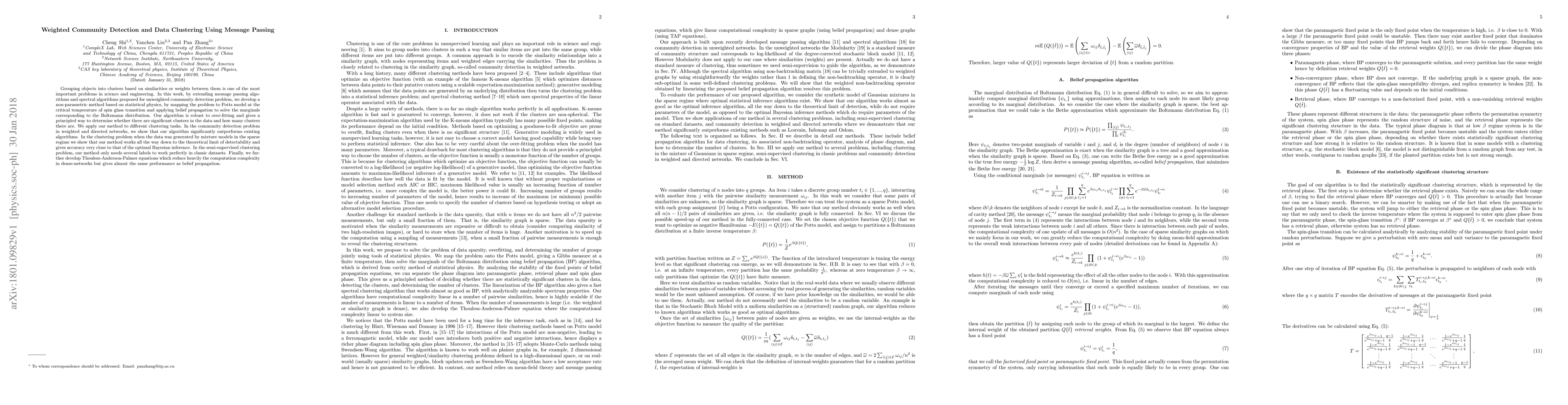 This paper proposes a novel weighted community detection and data clustering method based on message passing and statistical physics, significantly outperforming existing algorithms in various scenarios, including weighted and directed networks, sparse mixture models, and semi-supervised clustering, while also introducing computational efficiency improvements.