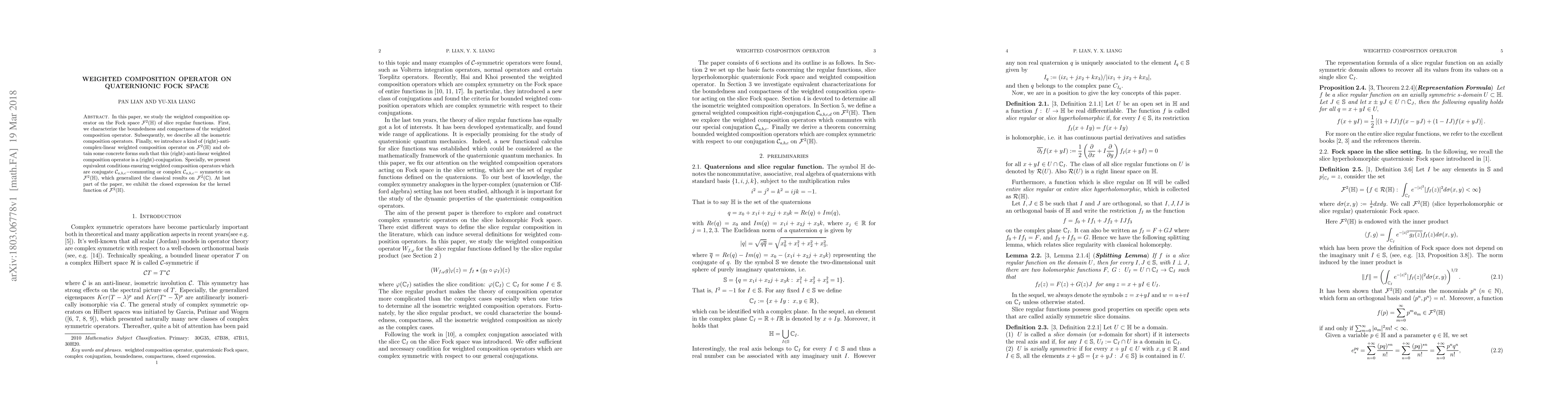 In this paper, we study the weighted composition operator on the Fock space $\mf$ of slice regular functions. First, we characterize the boundedness and compactness of the weighted composition operator. Subsequently, we describe all the isometric composition operators. Finally, we introduce a kind of (right)-anti-complex-linear weighted composition operator on $\mf$ and obtain some concrete forms such that this (right)-anti-linear weighted composition operator is a (right)-conjugation. Specially, we present equivalent conditions ensuring weighted composition operators which are conjugate $\mathcal{C}_{a,b,c}-$commuting or complex $\mathcal{C}_{a,b,c}-$ symmetric on $\mf$, which generalized the classical results on $\mathcal{F}^2(\mathbb{C}).$ At last part of the paper, we exhibit the closed expression for the kernel function of $\mf.$