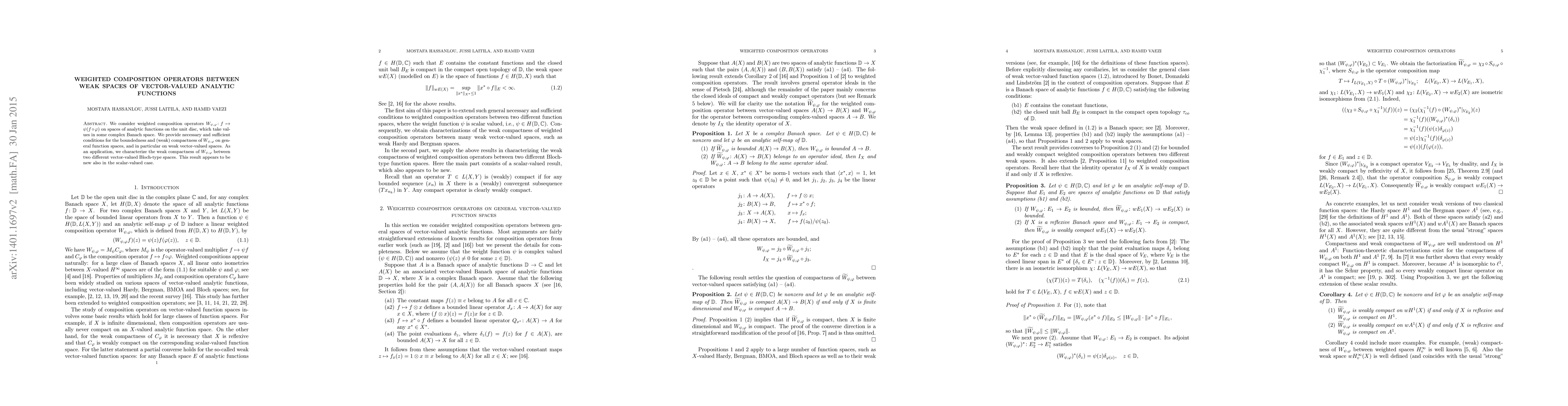 This paper studies weighted composition operators on analytic function spaces on the unit disc that map into complex Banach spaces, providing conditions for their boundedness and weak compactness. It also introduces new characterizations of weak compactness between vector-valued Bloch-type spaces.