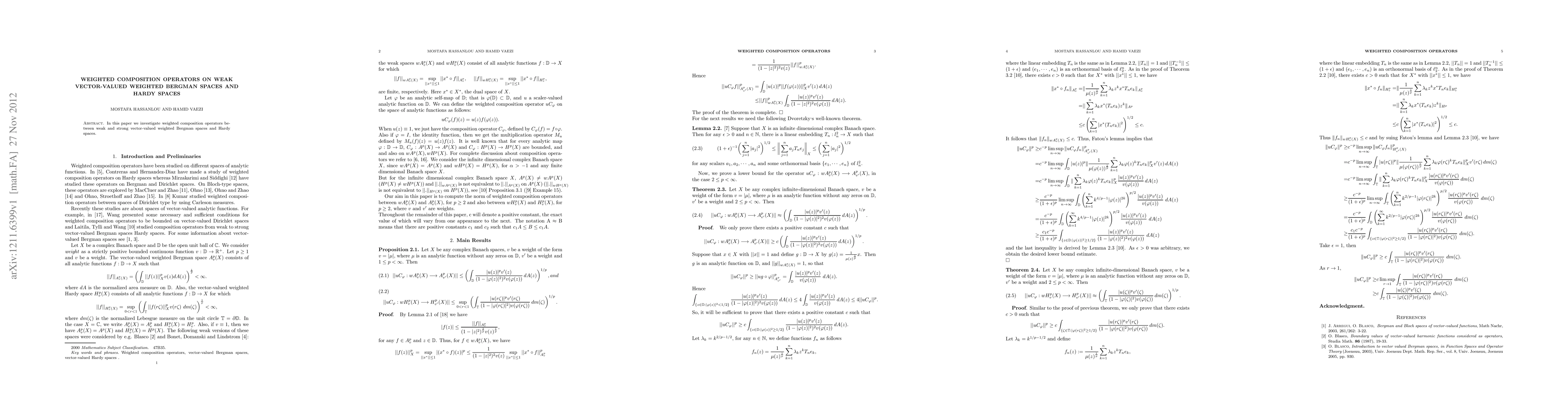 Summary: This paper studies the behavior of weighted composition operators between vector-valued weighted Bergman spaces and Hardy spaces, focusing on the differences between weak and strong vector-valued versions.
