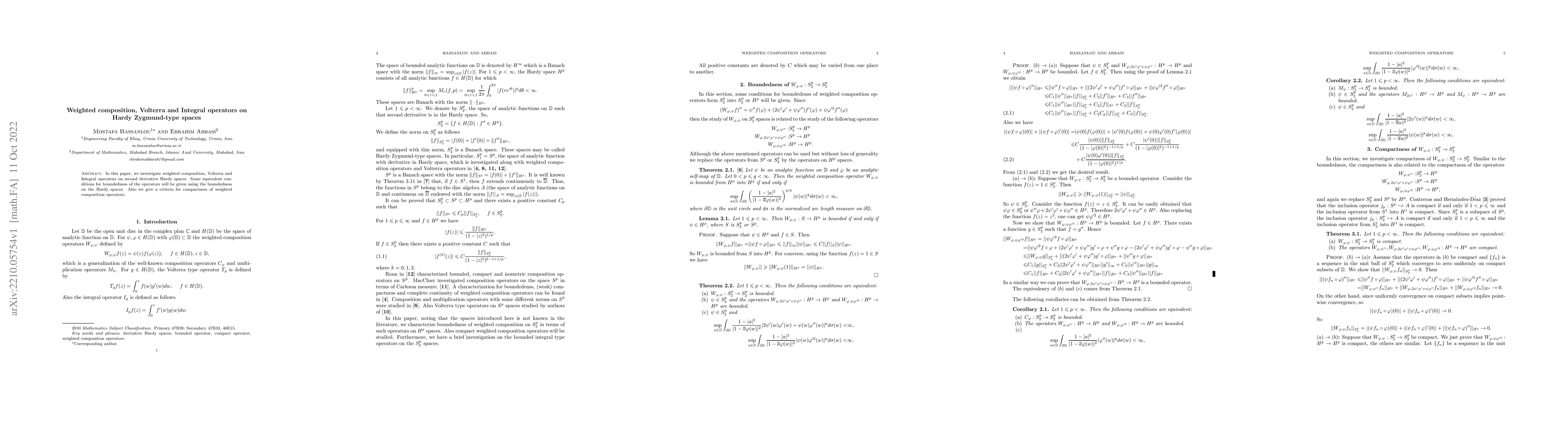 This paper studies weighted composition, Volterra, and Integral operators within second derivative Hardy spaces, providing conditions for their boundedness and criteria for the compactness of weighted composition operators.