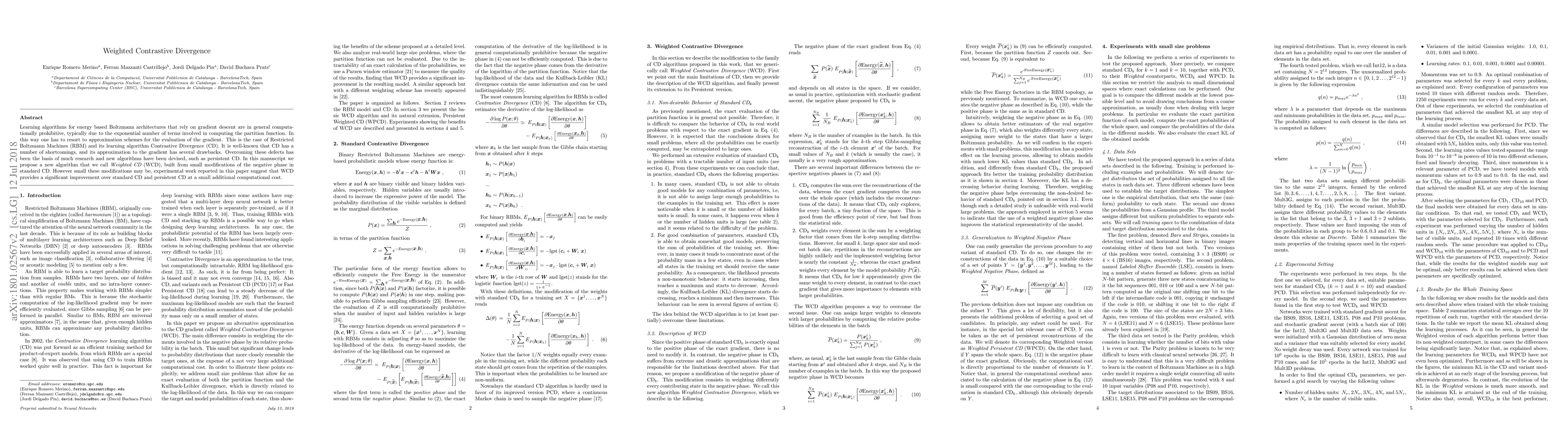 This paper proposes Weighted Contrastive Divergence (WCD), a new learning algorithm for Restricted Boltzmann Machines that improves upon standard Contrastive Divergence (CD) and persistent CD by making small modifications to the negative phase. Experimental results indicate that WCD offers significant improvements over existing methods with minimal extra computational cost.