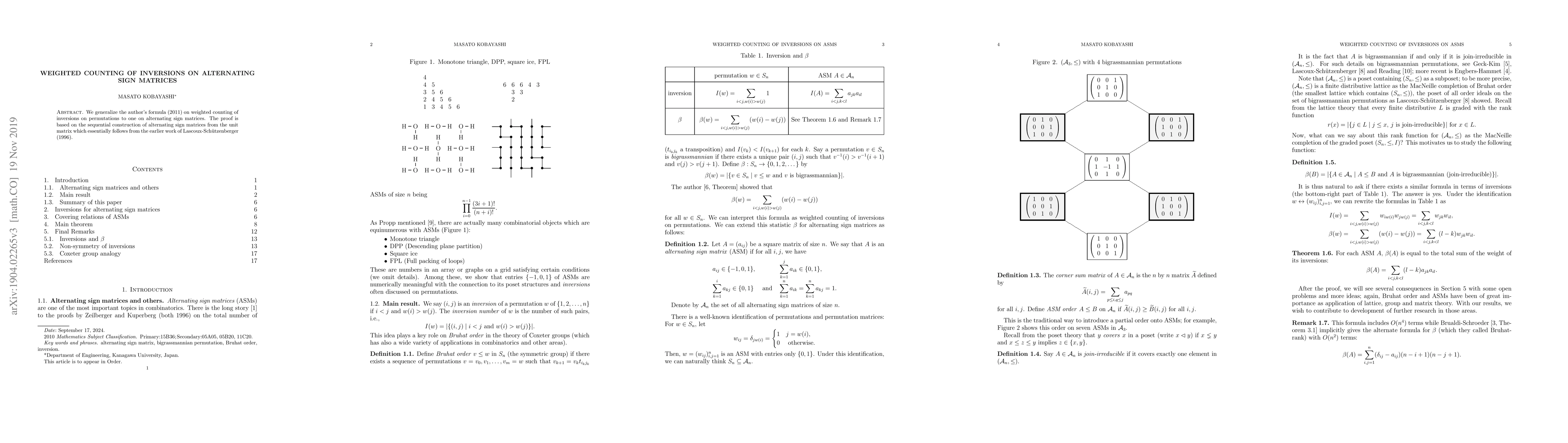 This paper extends the weighted counting of inversions from permutations to alternating sign matrices, utilizing a sequential construction method from the unit matrix developed by Brualdi-Schroeder and the author in 2017. The proof leverages recent advancements in the understanding of alternating sign matrices.