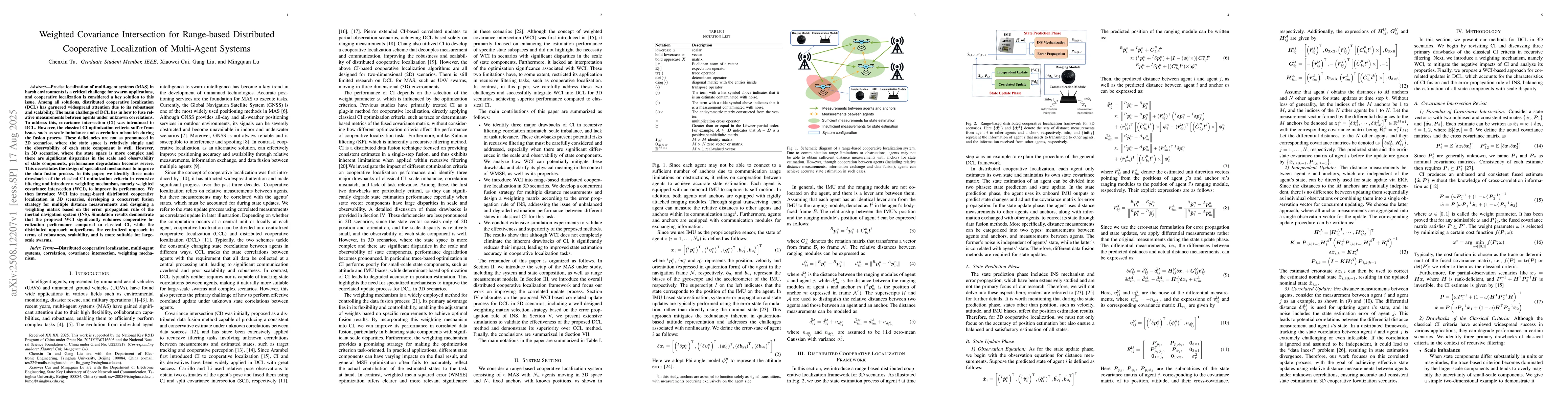 Precise localization of multi-agent systems (MAS) in harsh environments is a critical challenge for swarm applications, and cooperative localization is considered a key solution to this issue. Among all solutions, distributed cooperative localization (DCL) has garnered widespread attention due to its robustness and scalability. The main challenge of DCL lies in how to fuse relative measurements between agents under unknown correlations. To address this, covariance intersection (CI) was introduced to DCL. However, the classical CI optimization criteria suffer from issues such as scale imbalance and correlation mismatch during the fusion process. These deficiencies are not as pronounced in 2D scenarios, where the state space is relatively simple and the observability of each state component is well. However, in 3D scenarios, where the state space is more complex and there are significant disparities in the scale and observability of state components, performance degradation becomes severe. This necessitates the design of specialized mechanisms to improve the data fusion process. In this paper, we identify three main drawbacks of the classical CI optimization criteria in recursive filtering and introduce a weighting mechanism, namely weighted covariance intersection (WCI), to improve its performance. We then introduce WCI into range-based distributed cooperative localization in 3D scenarios, developing a concurrent fusion strategy for multiple distance measurements and designing a weighting matrix based on the error propagation rule of the inertial navigation system (INS). Simulation results demonstrate that the proposed WCI significantly enhances cooperative localization performance compared to classical CI, while the distributed approach outperforms the centralized approach in terms of robustness, scalability, and is more suitable for large-scale swarms.