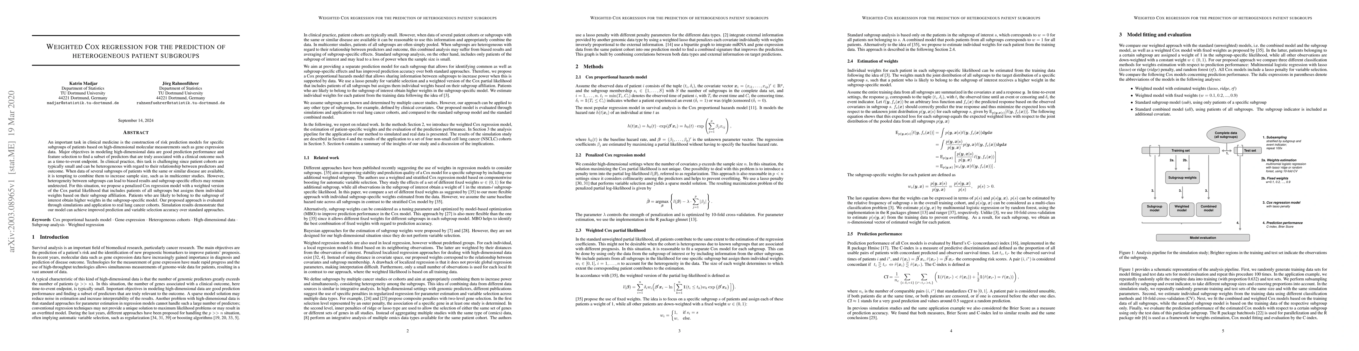 A new statistical approach called weighted Cox regression is proposed to improve prediction performance and feature selection in patient subgroup analysis. This method assigns individual weights to patients based on their subgroup affiliation, allowing for more accurate modeling of heterogeneous subgroups.