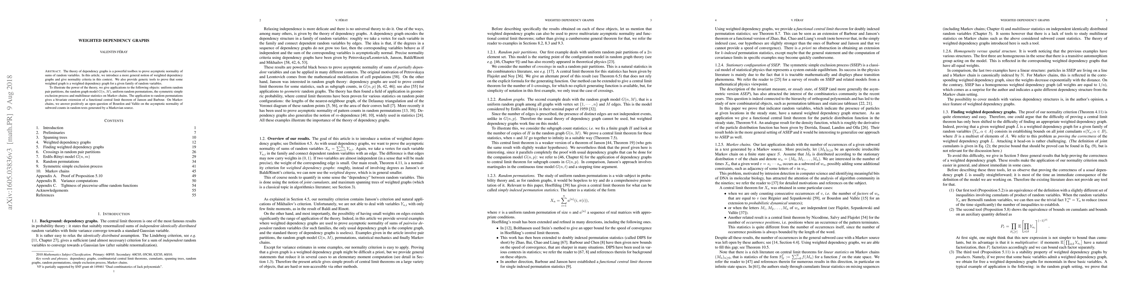 This paper introduces weighted dependency graphs, offering criteria for asymptotic normality in sums of random variables and applications to various probabilistic models like uniform random pair partitions and Markov chains, extending results for random permutations and resolving an open question on subword counts in Markovian texts.
